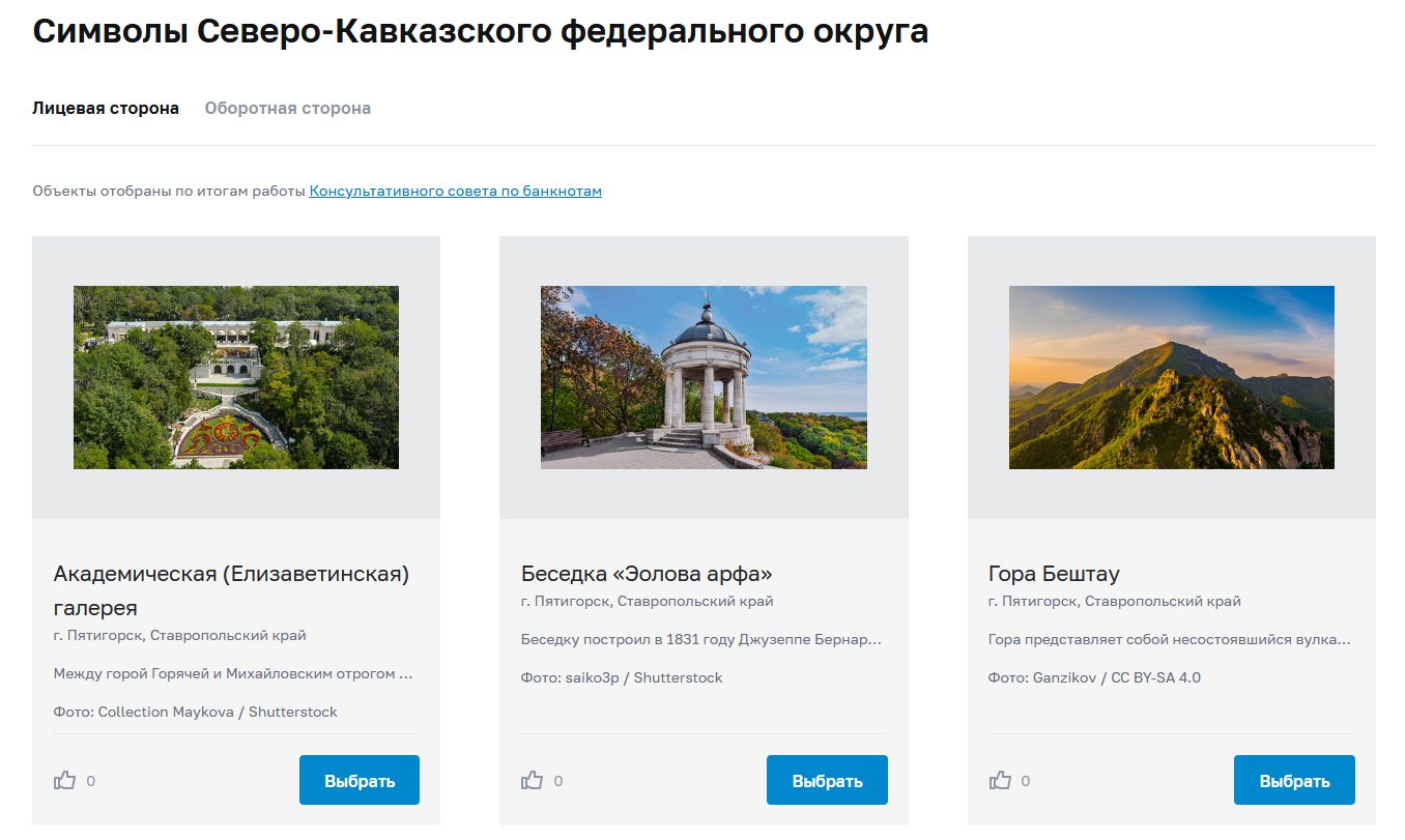 На выбор доступны шесть символов Пятигорска для лицевой стороны банкноты. А для оборотной — 16 символов разных регионов Северо-Кавказского федерального округа.