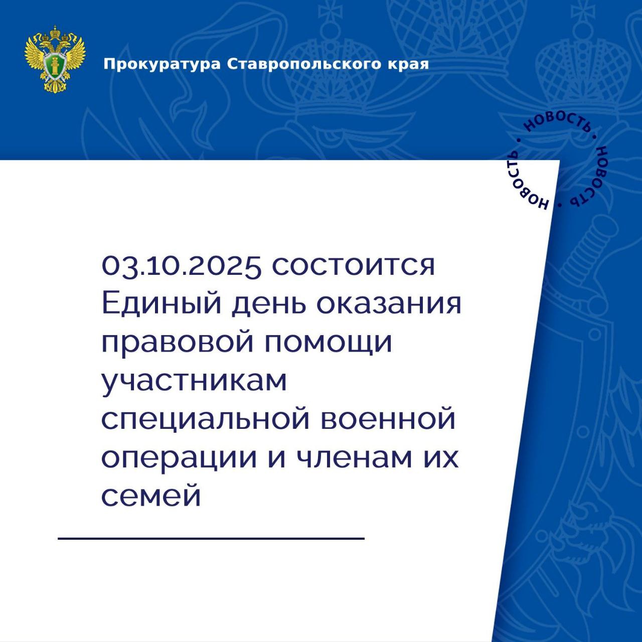 В соответствии с распоряжением прокурора Ставропольского края Юрия Немкина «О проведении в прокуратуре Ставропольского края Единого дня оказания правовой помощи участникам специальной военной операции и членам их семей» в прокуратуре края, прокуратурах городов, районов и межрайонных прокуратурах в первую пятницу каждого месяца в рабочее время проводится прием участников специальной военной операции и членов их семей.