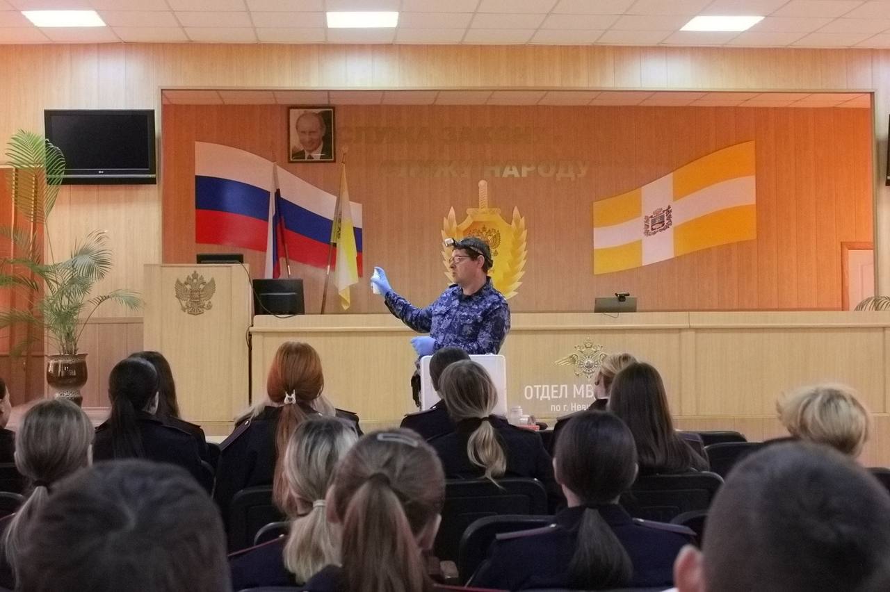 Представители различных подразделений – следственного отдела, отдела дознания, уголовного розыска, правовой группы и экспертно-криминалистического отдела – поделились со студентами особенностями своей службы. Некоторые наглядно продемонстрировали, как используют различные спецсредства во время работы.