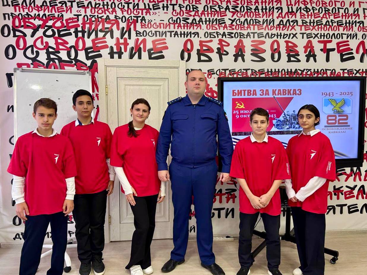 На открытых уроках работник прокуратуры поделился с учениками историей битвы за Кавказ, подчеркнув значение мужества и героизма защитников нашей Родины, а также указал на необходимость поддержания духовной стойкости, любви к Родине, гордости за свою страну и её героев.