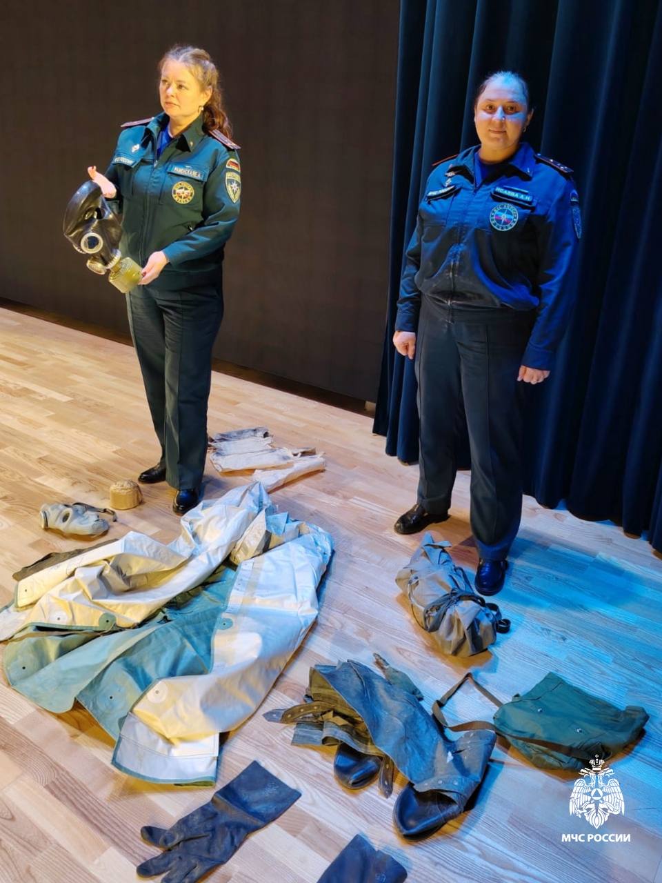 Самой увлекательной частью встречи стала демонстрация средств индивидуальной защиты. Сотрудники чрезвычайного ведомства показали настоящие образцы защитного снаряжения.