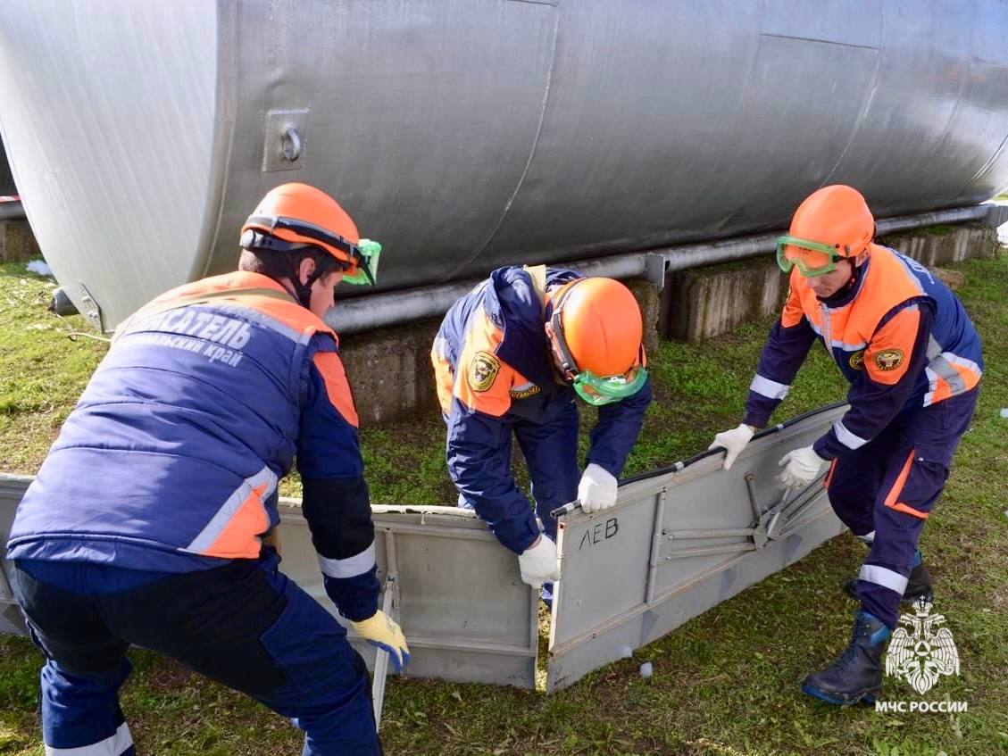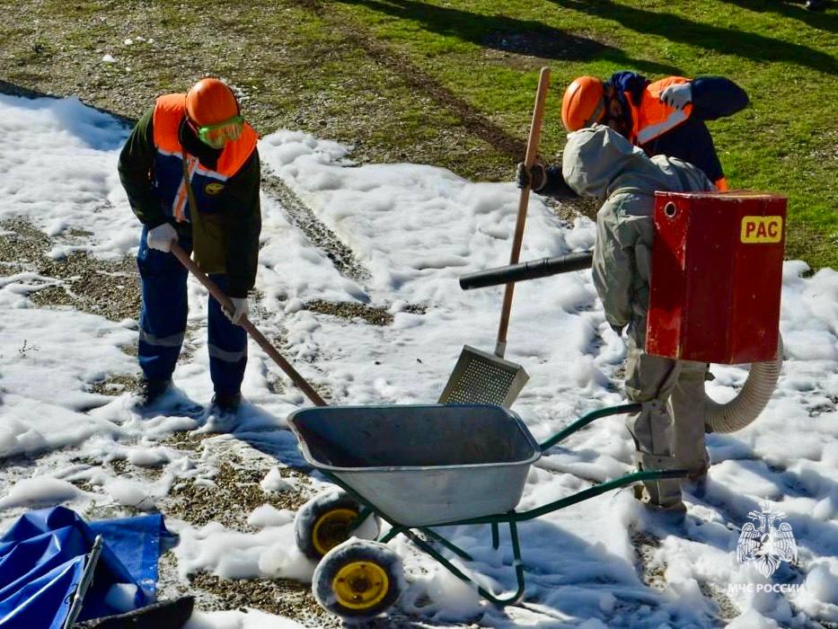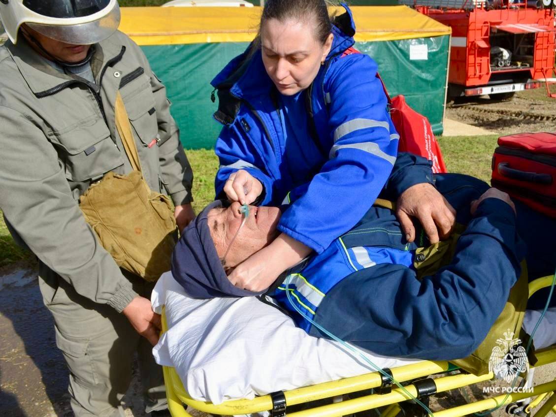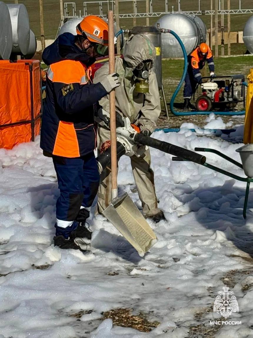 Первыми прибыли расчеты МЧС Ставрополья. Они провели разведку, обнаружили и передали «пострадавших» медикам. Затем пожарные ликвидировали возгорание в зоне разлива.