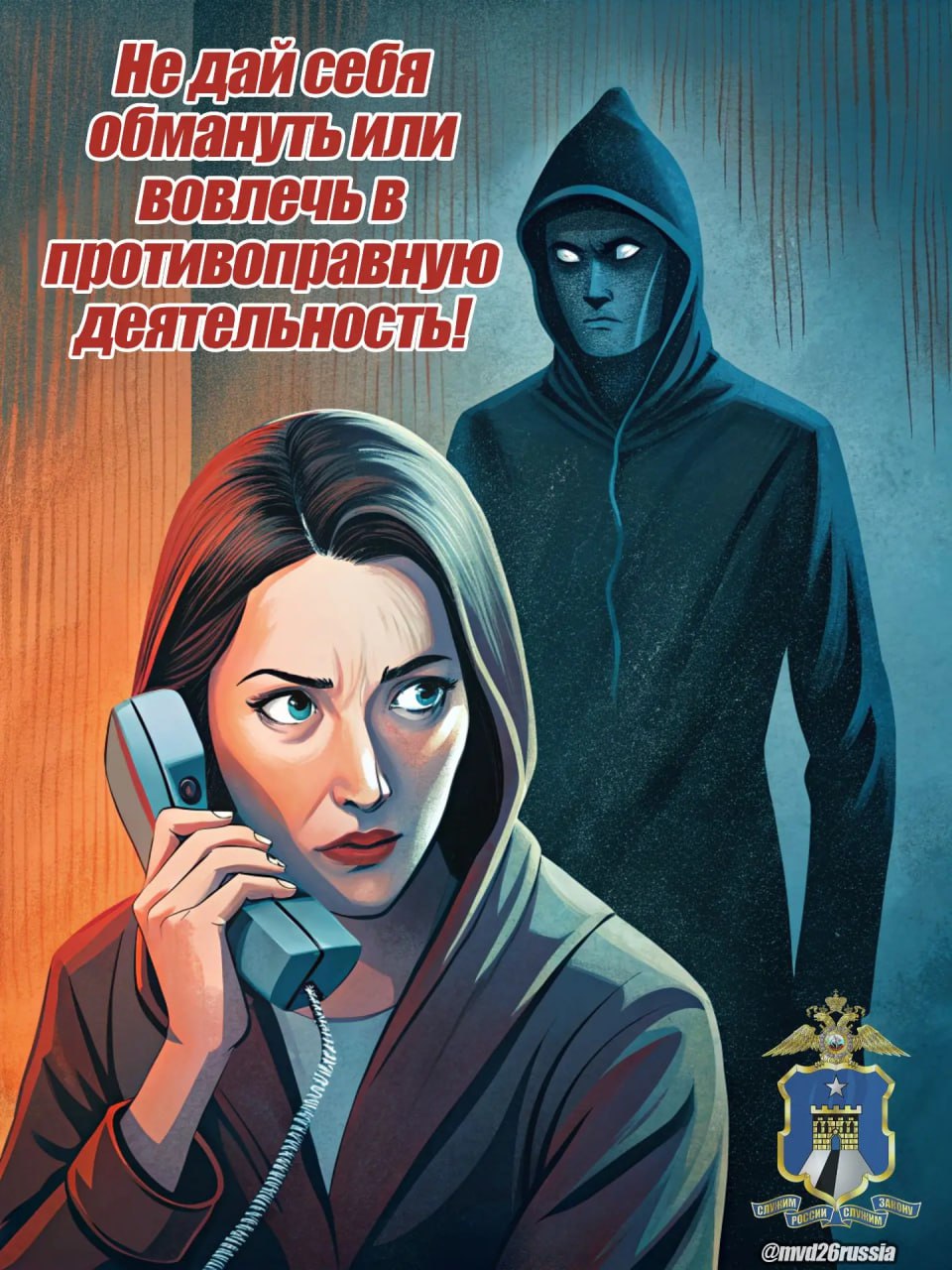 ГУ МВД России по Ставропольскому краю призывает быть бдительными и общаться с незнакомцами по телефону или в интернете. Если вам предлагают совершить преступление за вознаграждение в качестве решения каких-то проблем или под любым другим предлогом, сразу прекратите общение и сообщите об этом в полицию.