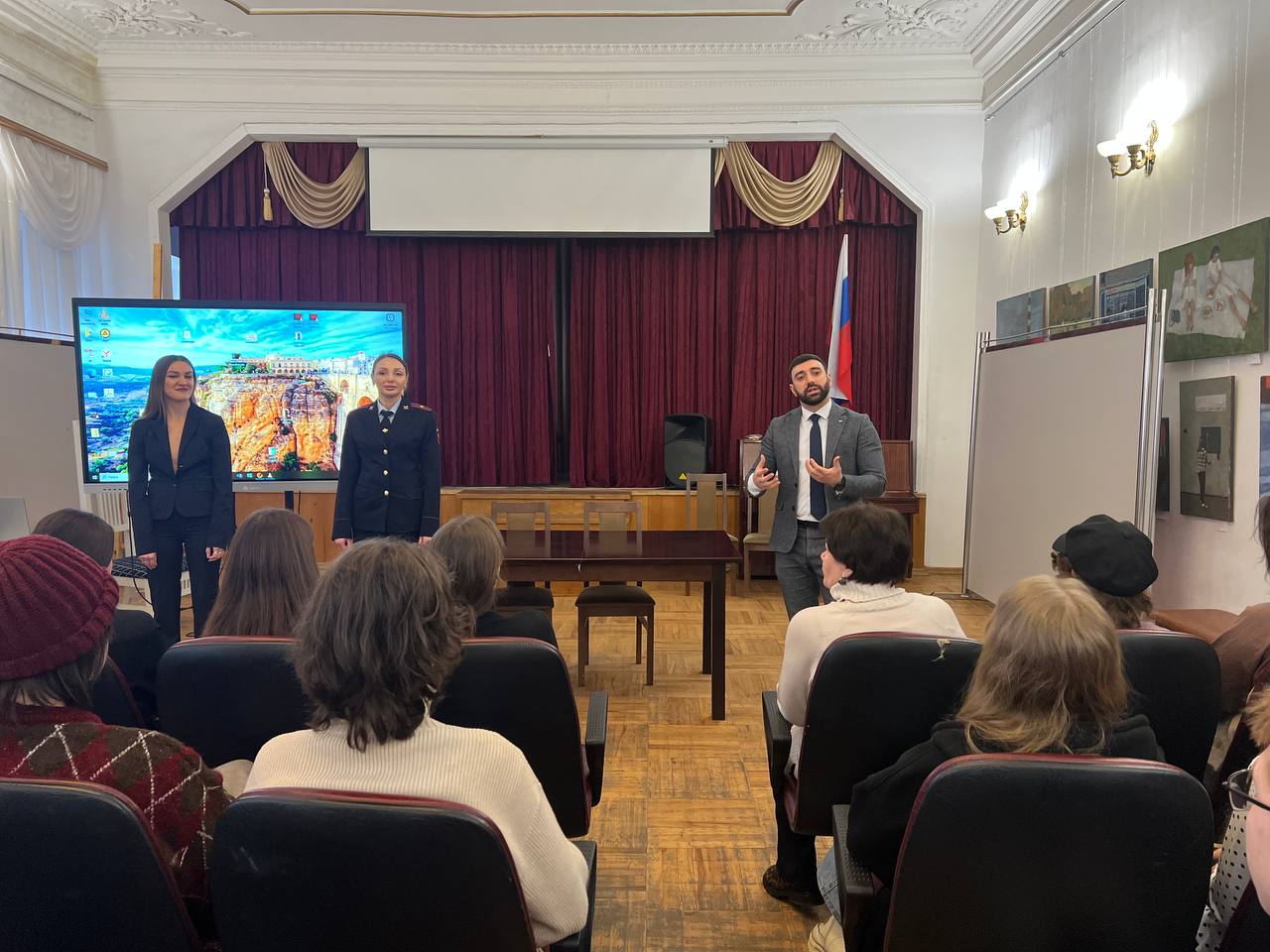 На базе Ставропольского краевого художественного училища прошла профилактическая беседа со студентами. Спикерами выступили сотрудники Правового управления ГУ МВД России по Ставропольскому краю Амалия Сивцова и Валерия Пшихачева, а также председатель Общественного совета при краевом Главке Владимир Кайванов.