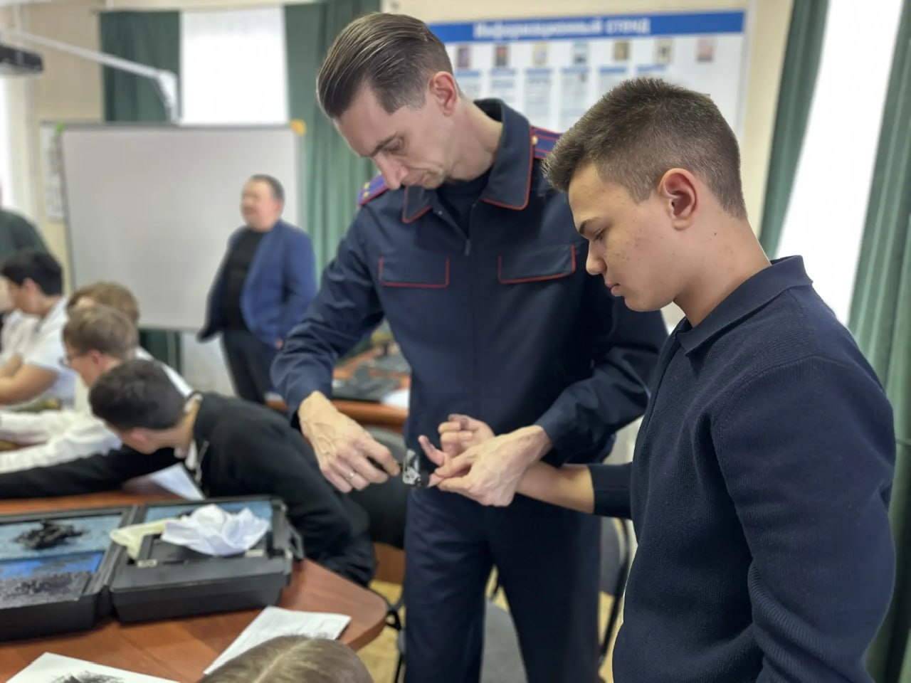 Офицеры продемонстрировали процесс дактилоскопирования - способа опознания человека по следам пальцев рук. Ребята не только узнали об уникальности папиллярных узоров, но и самостоятельно сняли друг у друга отпечатки пальцев для изучения под микроскопом.