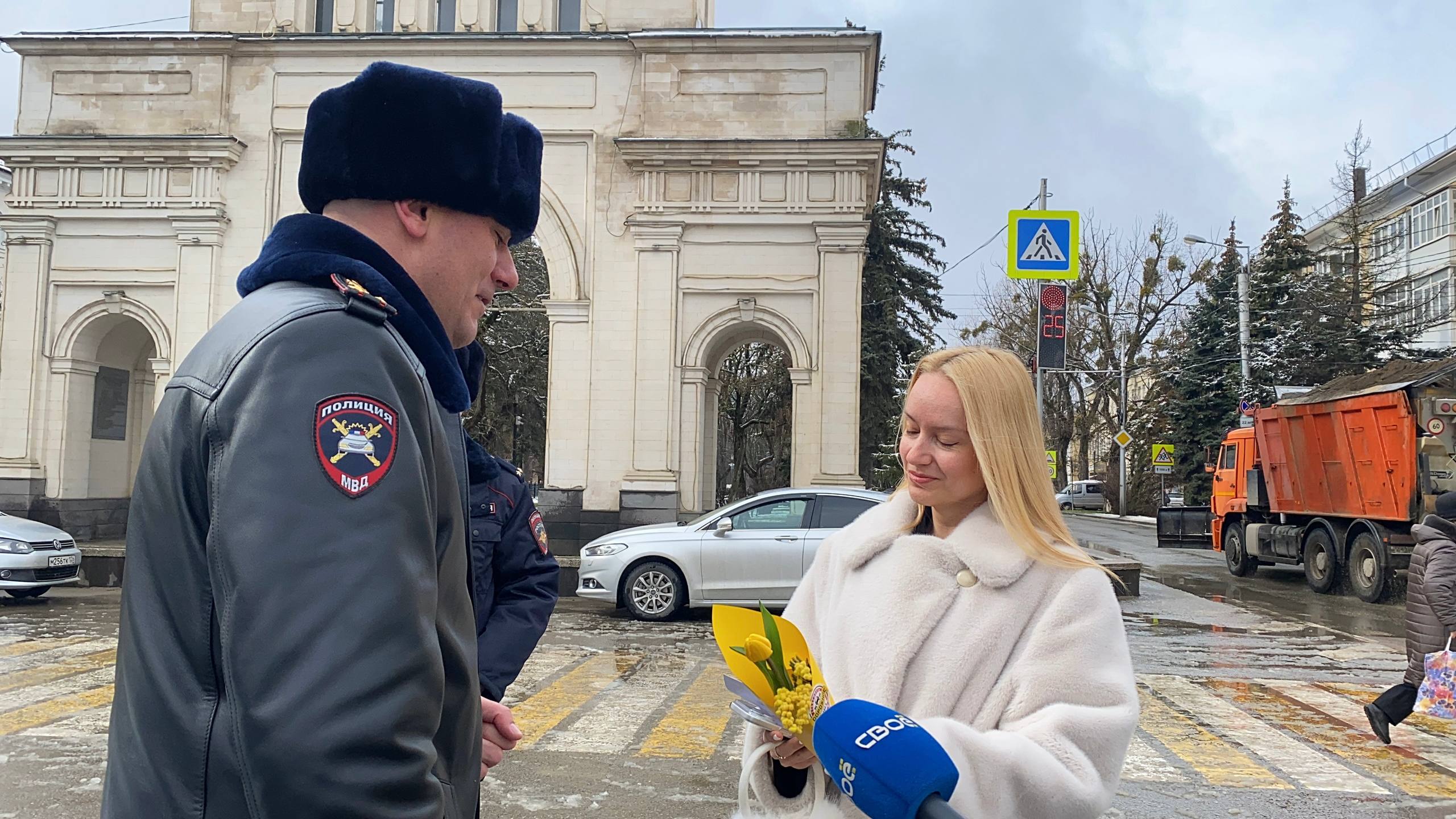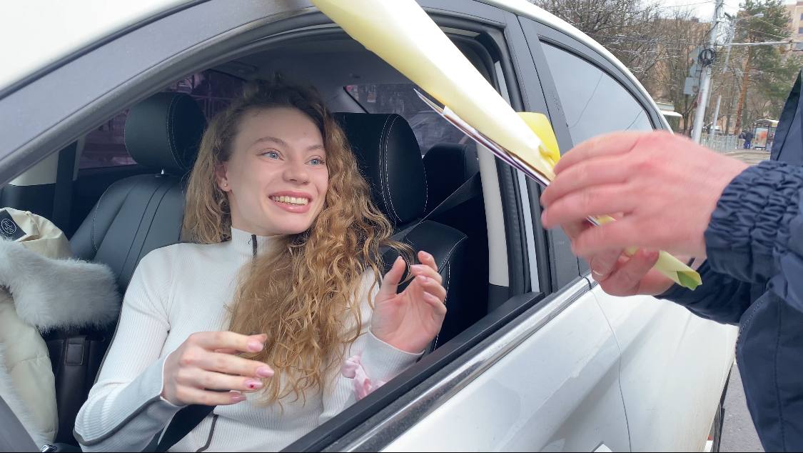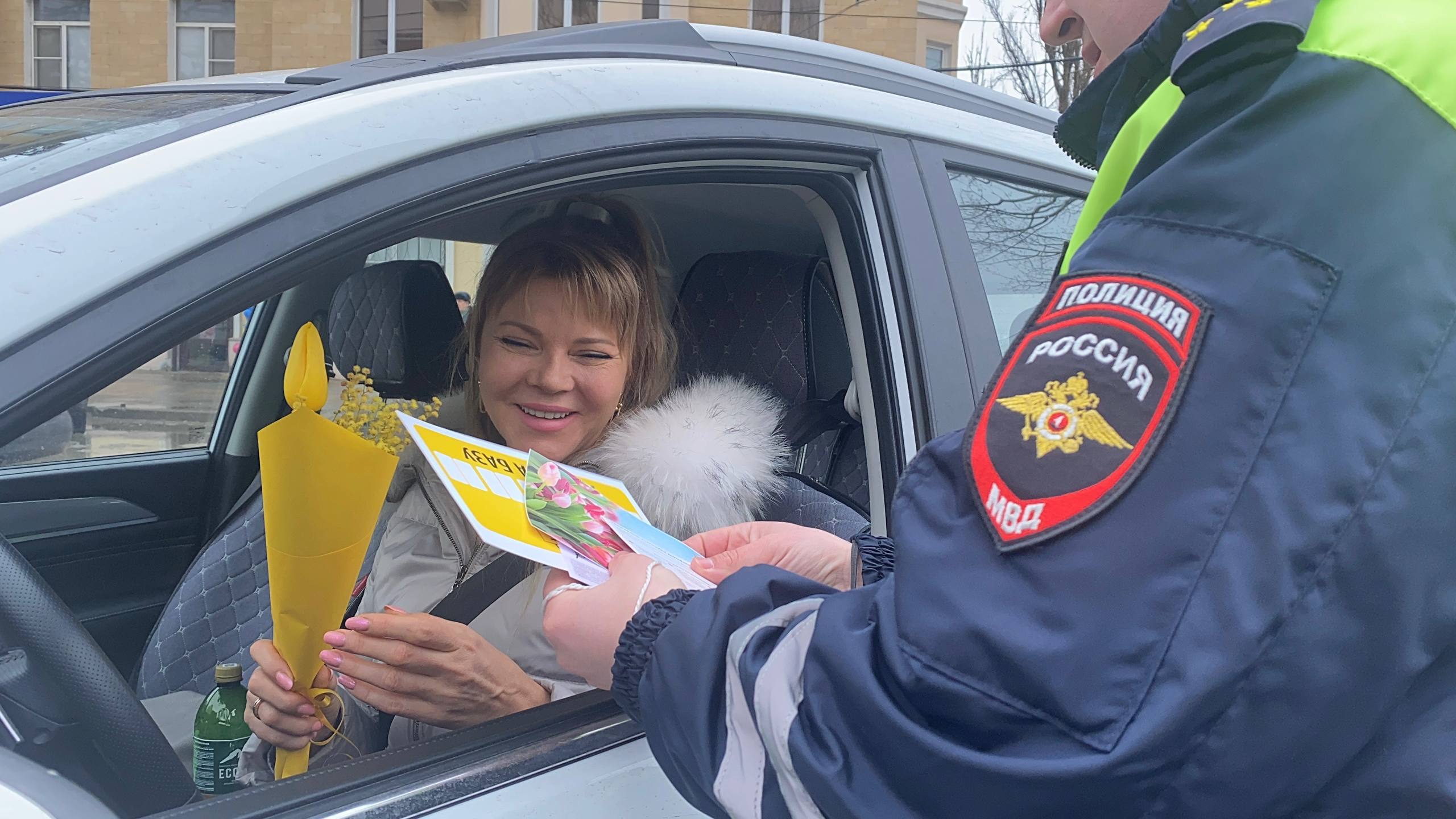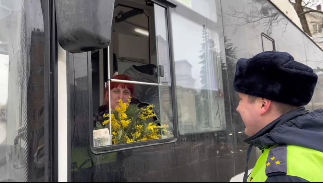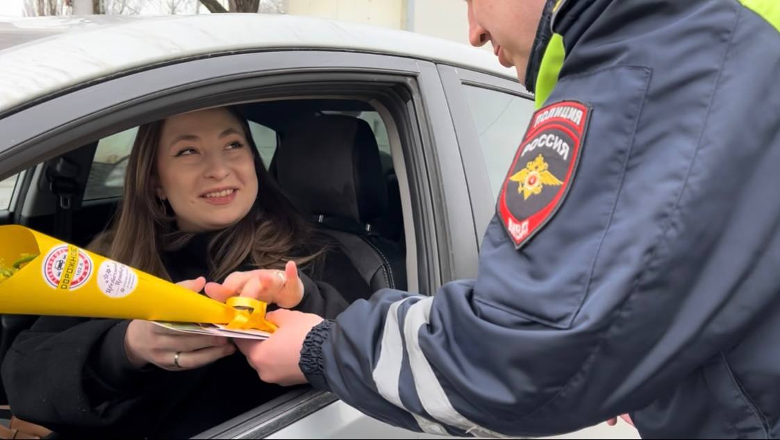 Вместо привычных проверок документов автоинспекторы останавливали случайных женщинучастниц дорожного движения, чтобы подарить им весеннее настроение.