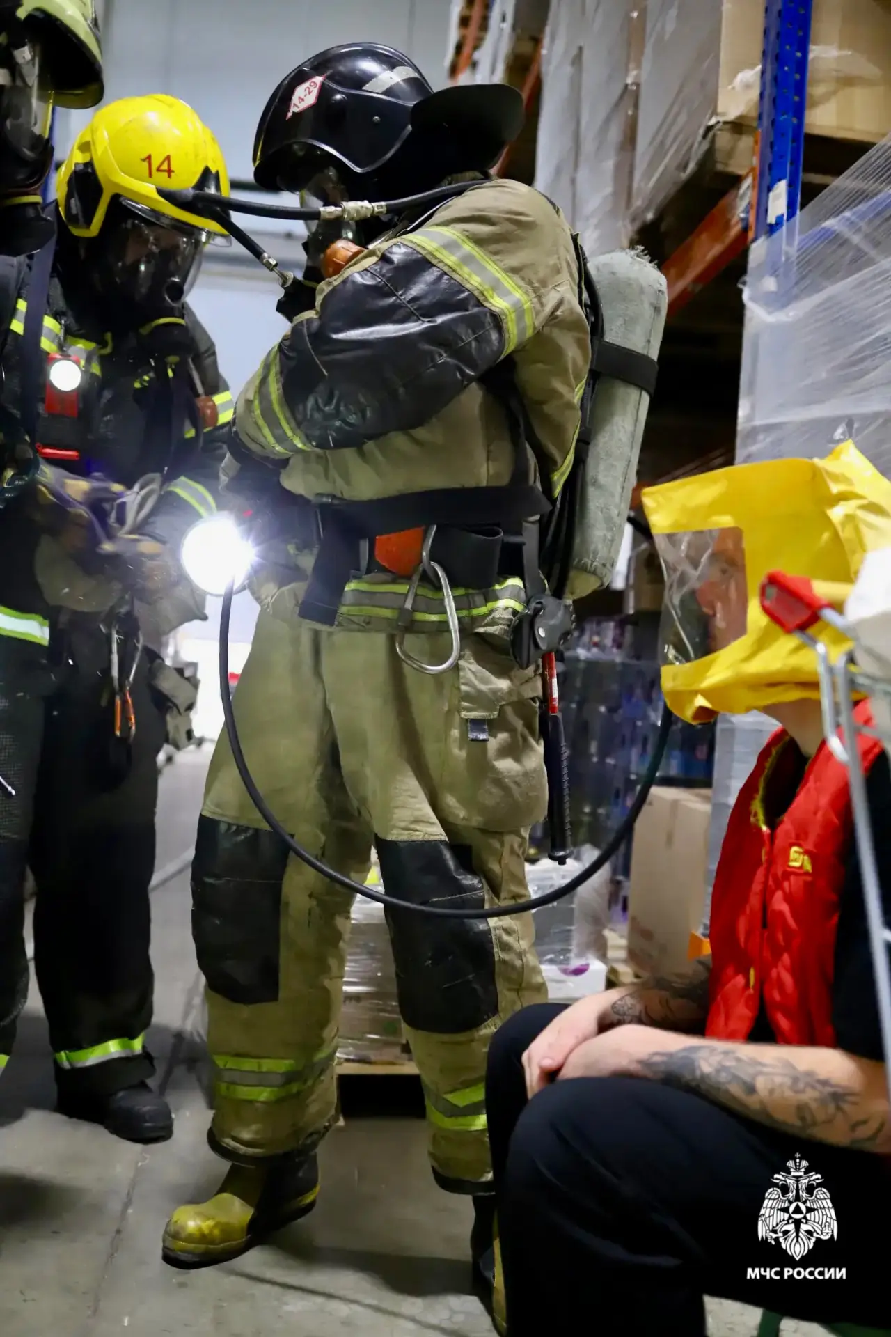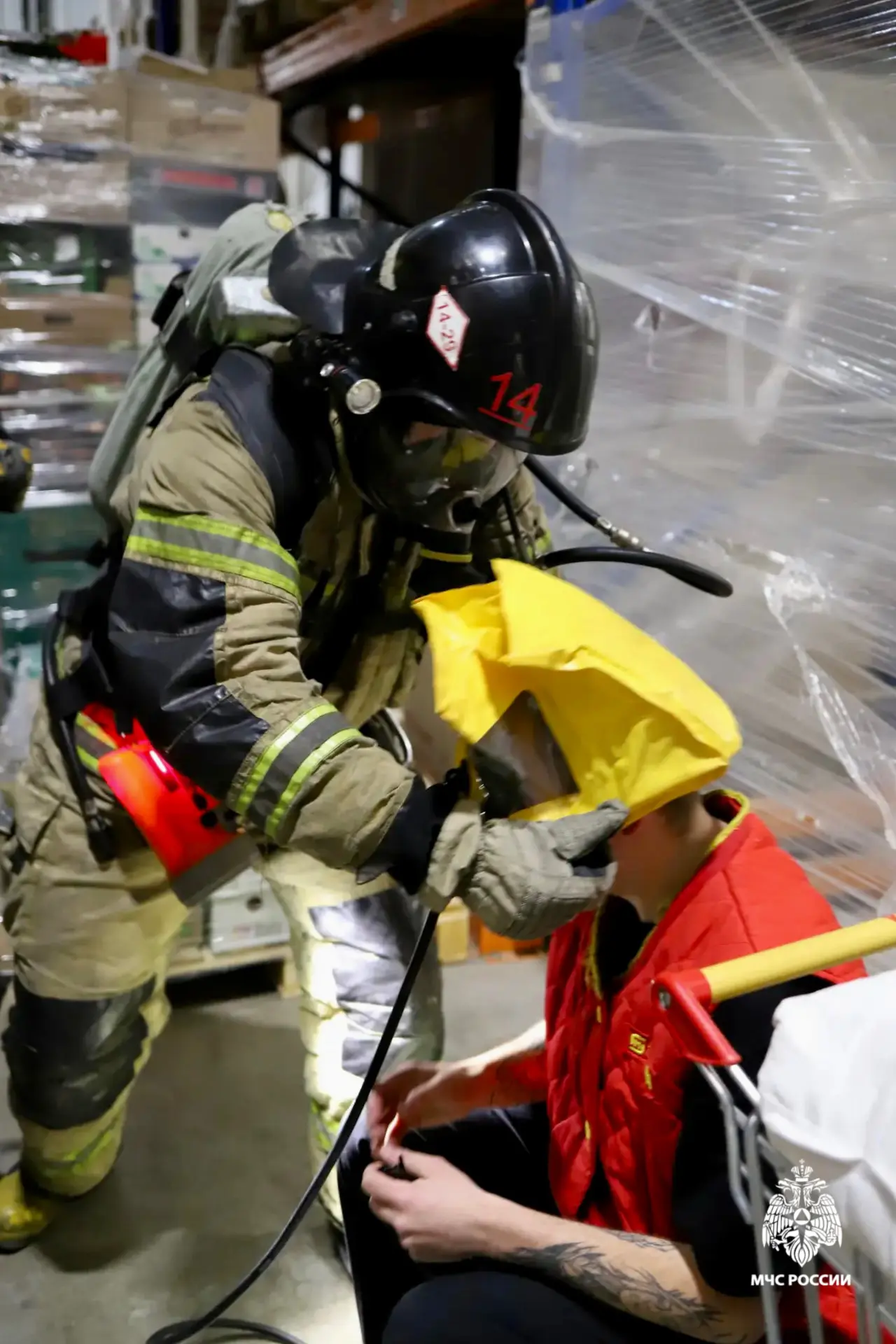 По сценарию, условный пожар возник на складе гипермаркета вследствие короткого замыкания.
