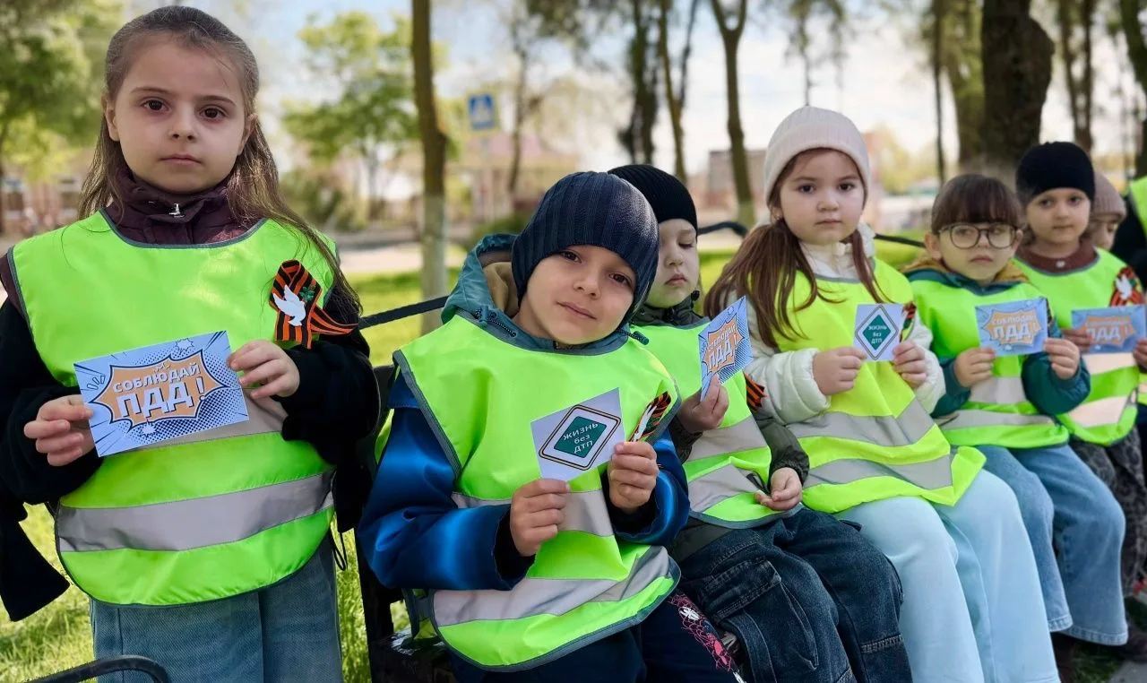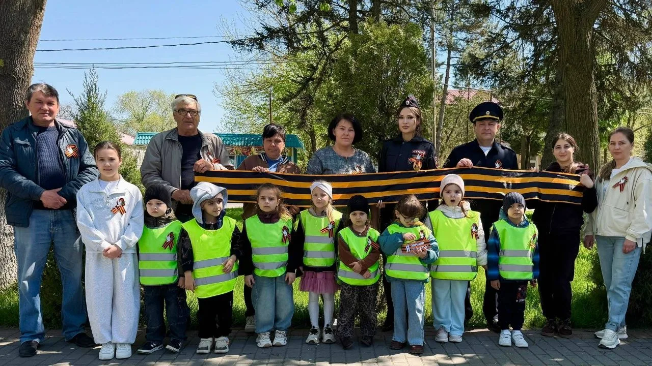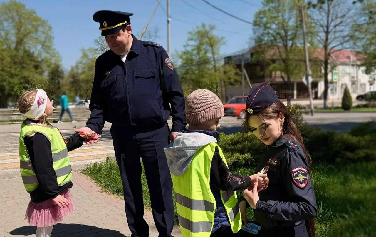 В преддверии Дня Победы в сквере станицы Курской сотрудники Госавтоинспекции вместе с самыми юными помощниками – отрядом юных инспекторов движения детского сада «Светлячок» – вышли на улицы, чтобы вручить местным жителям главный символ мужества и славы – георгиевскую ленту.