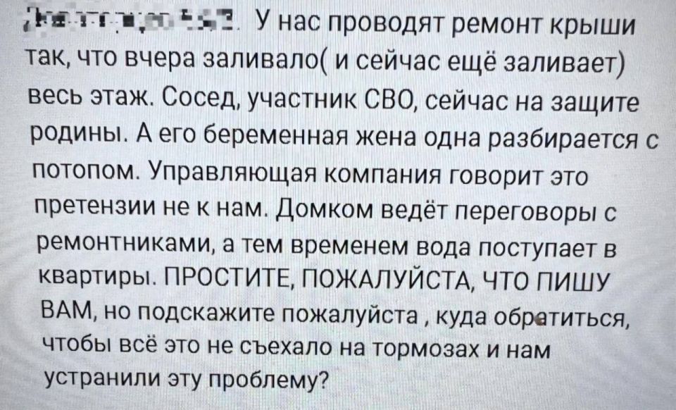 Женщина живёт на девятом этаже дома № 63/1 по улице Доваторцев. Ремонт крыши здесь начали неделю назад. По словам читательницы, досталось не только её квартире, но и соседям снизу, а управляющая компания на жалобы не реагирует. «На данный момент у...