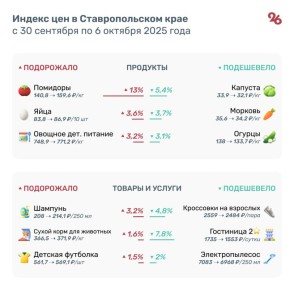 За неделю помидоры подорожали ещё на 13% — с 140,8 до 159,6 рублей за килограмм. В регионе также поднялись цены на яйца, детское питание, одежду, корм для животных и средства личной гигиены. При этом на Ставрополье подешевели морковь, огурцы и...