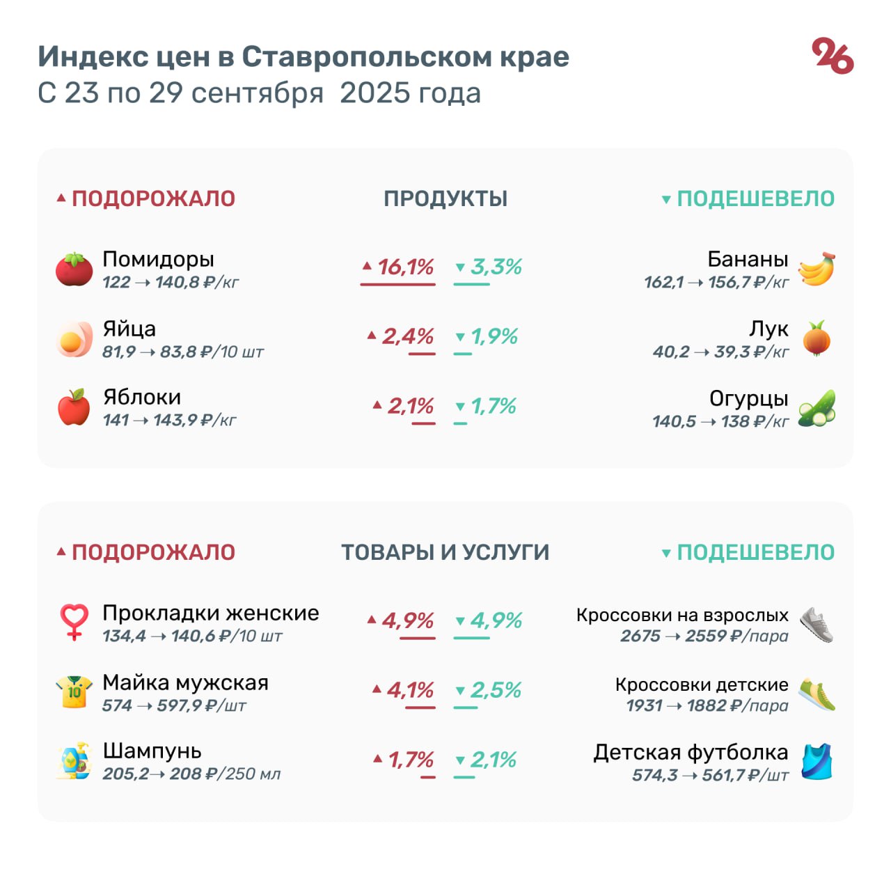 Цена помидоров на Ставрополье за неделю выросла ещё на 16%. Также в регионе подорожали яйца и яблоки, а бананы, лук и огурцы — подешевели.