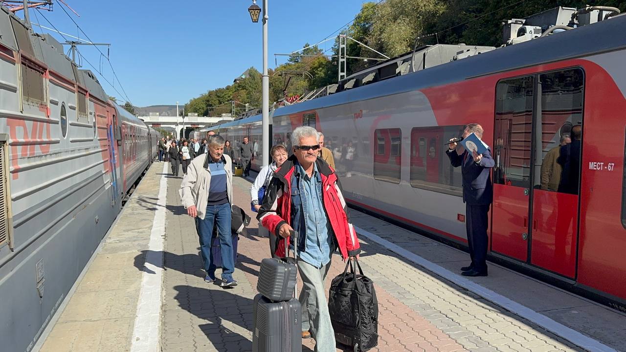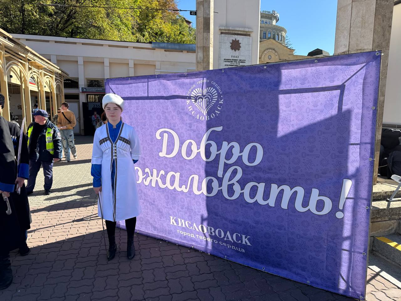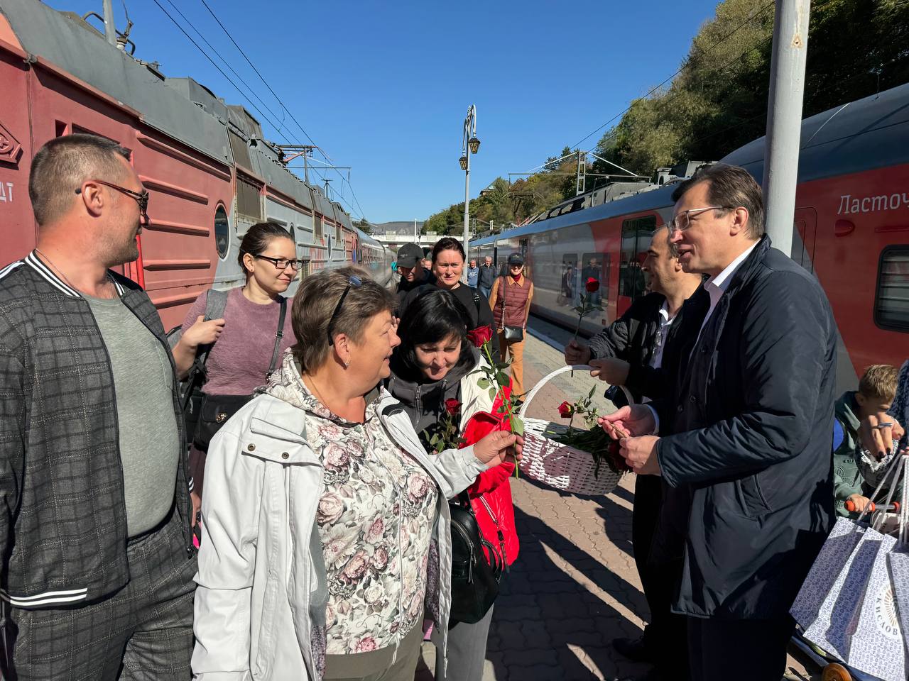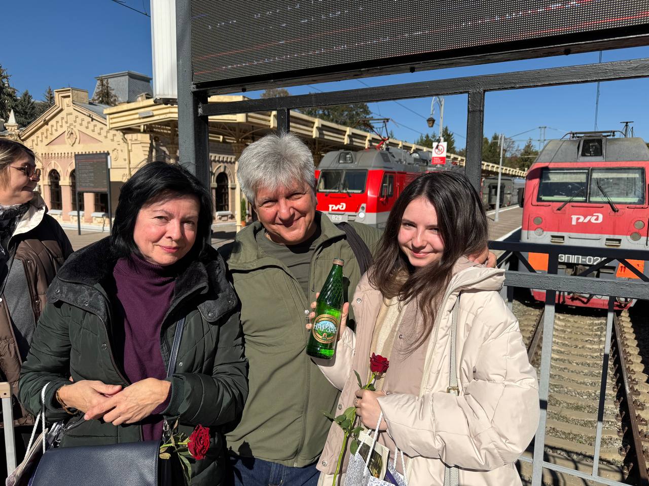 Всех прибывших на поезде «Санкт-Петербург - Кисловодск» угостили нарзаном, вручили им цветы, курортную газету и фирменные сувениры.