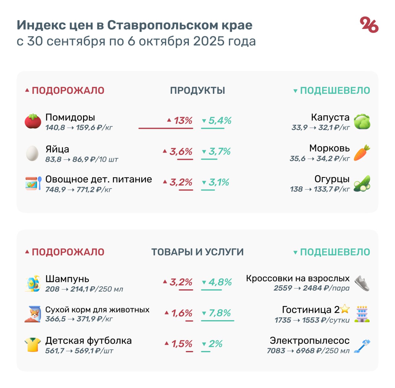 За неделю помидоры подорожали ещё на 13% — с 140,8 до 159,6 рублей за килограмм. В регионе также поднялись цены на яйца, детское питание, одежду, корм для животных и средства личной гигиены. При этом на Ставрополье подешевели морковь, огурцы и капуста.