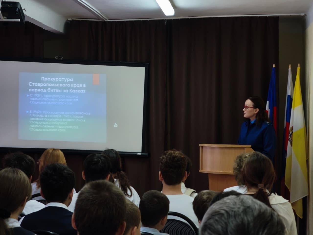 В гостях ЦДТЭиТ побывала помощник прокурора города Пятигорска младший советник юстиции Абрамова Кристина Валерьевна, которая рассказала ребятам о работе надзорных ведомств в период Битвы за Кавказ, о подвиге Клавдии Абрамовой—участницы антифашистского подполья в Ставрополе во время Великой Отечественной войны.