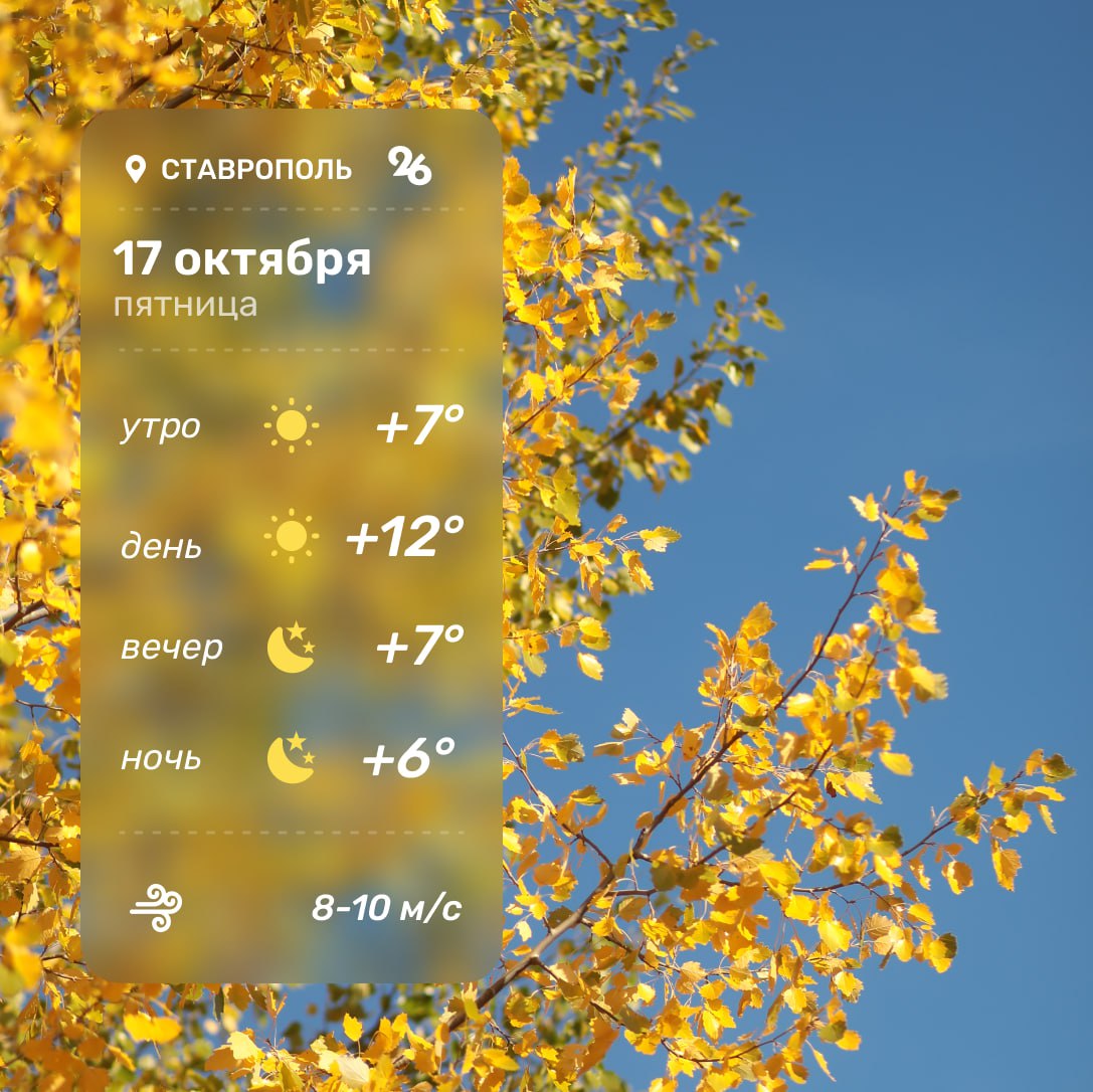 Ветер восточный 5-10 м/с. В субботу, 18 октября, температура воздуха по краю ночью +2...+7°, днём +14...+19°.В Ставрополе без существенных осадков, днём +15...+17°.
