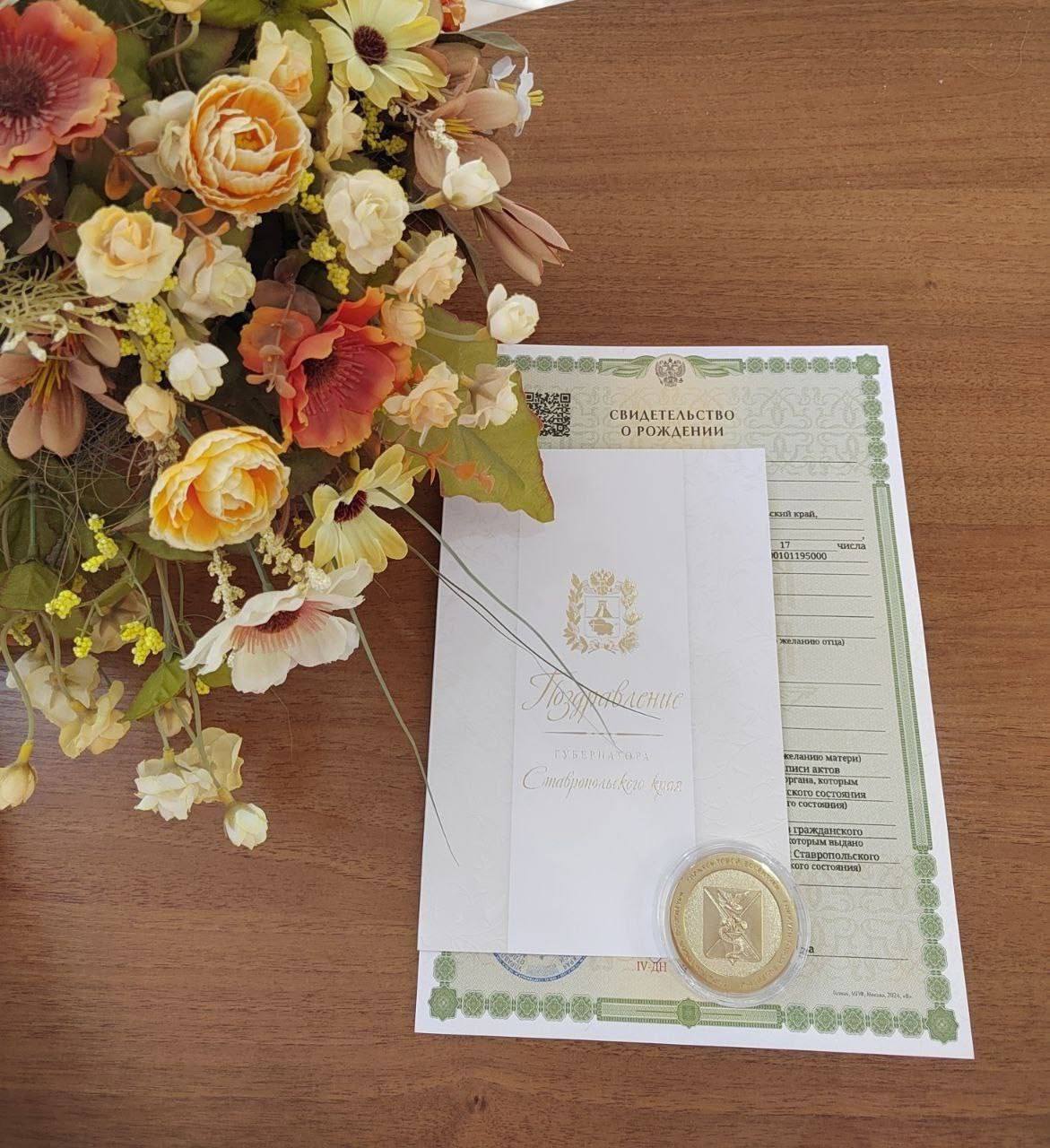 Ессентучанину вручили свидетельство о рождении дочери, поздравление губернатора Ставропольского края Владимира Владимирова и медаль «Родившемуся в городе Ессентуки».