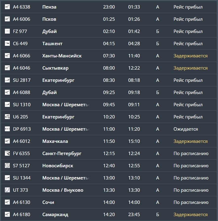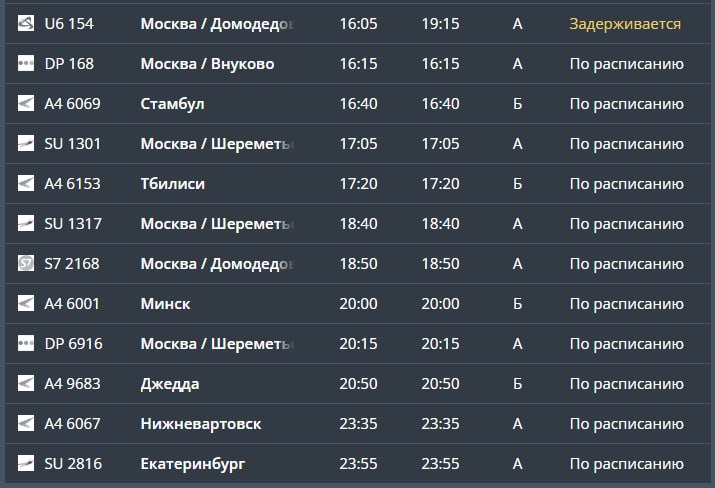 Один в Домодедово – на вылет (первый скрин), еще шесть – на прилет в Ханты-Мансийск, Сыктывкар, Махачкалу, Самарканд, Домодедово и Ташкент (второй и третий скрины).