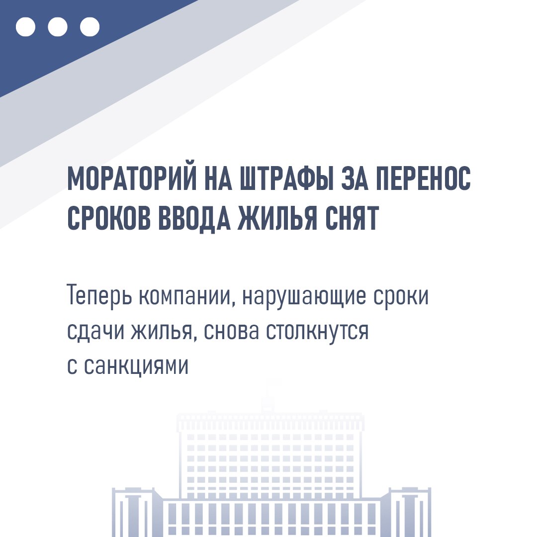 «Президент поручил не продлевать мораторий на штрафы для застройщиков за нарушение сроков передачи объектов долевого строительства. Такое решение мы уже приняли», — отметил председатель Правительства РФ Михаил Мишустин.