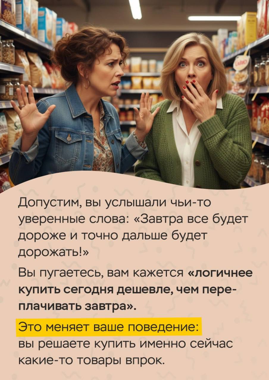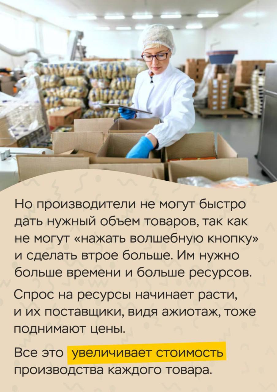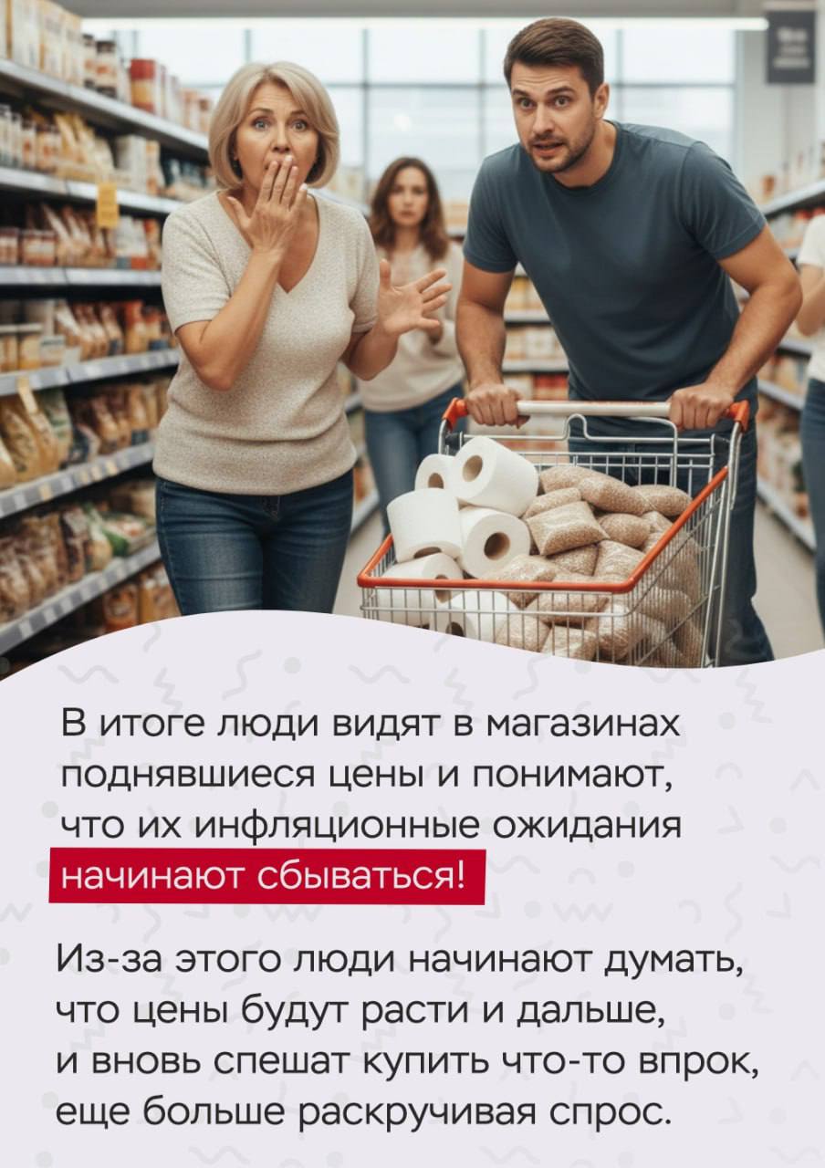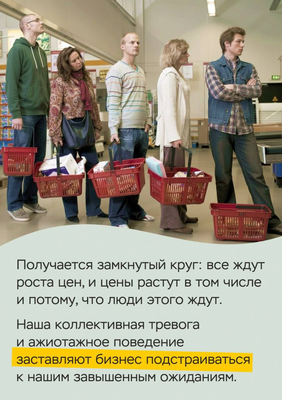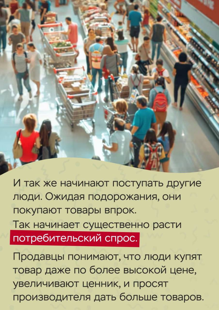 Чем больше мы боимся роста цен – тем активнее покупаем (а вдруг завтра подорожает!). Чем выше наш спрос – тем быстрее растут цены: продавцы не успевают сделать больше товаров, поэтому увеличивают ценник, а за ними увеличивают ценник упаковщики, логисты и все, кто находится в цепочке производства. И в итоге товар дорожает.