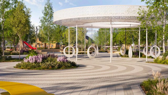 В новом сквере сделают навес с качелями, стол, беседку, круговые и светящиеся скамьи, кафе с уличной зоной, небольшой амфитеатр, детскую площадку и горки в форме елки.