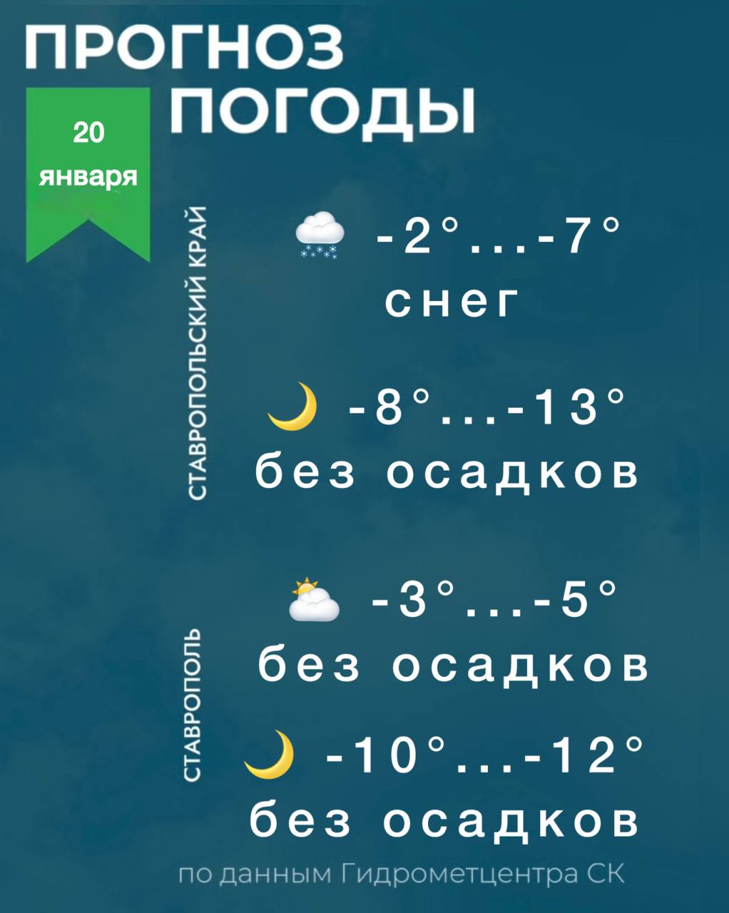 Сегодня днем в крае -2°...-7°, местами небольшой снег, утром туман, гололедно-изморозевые отложения, на дорогах местами гололедица; ночью -8°...-13°, преимущественно без осадков, на дорогах местами гололедица.