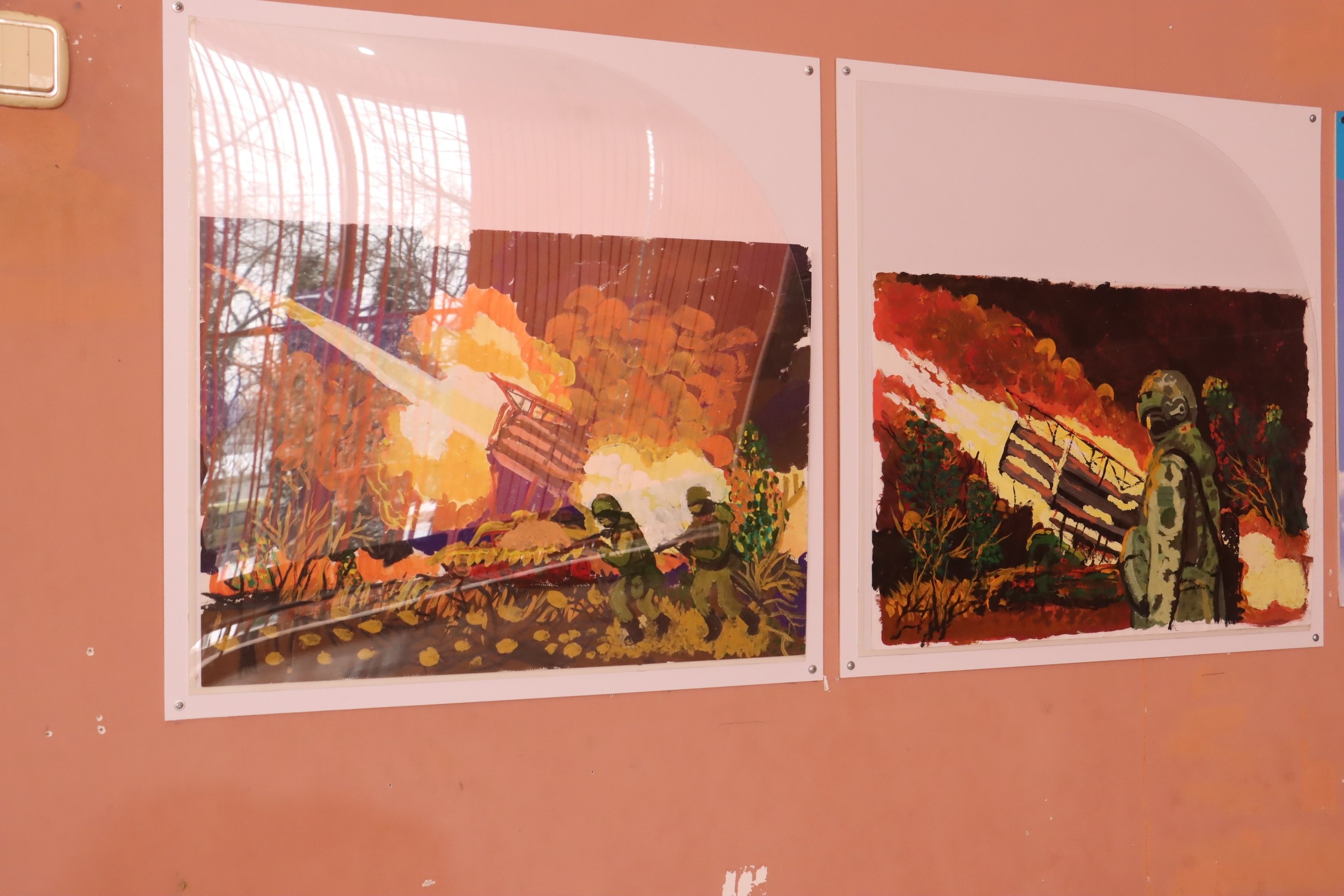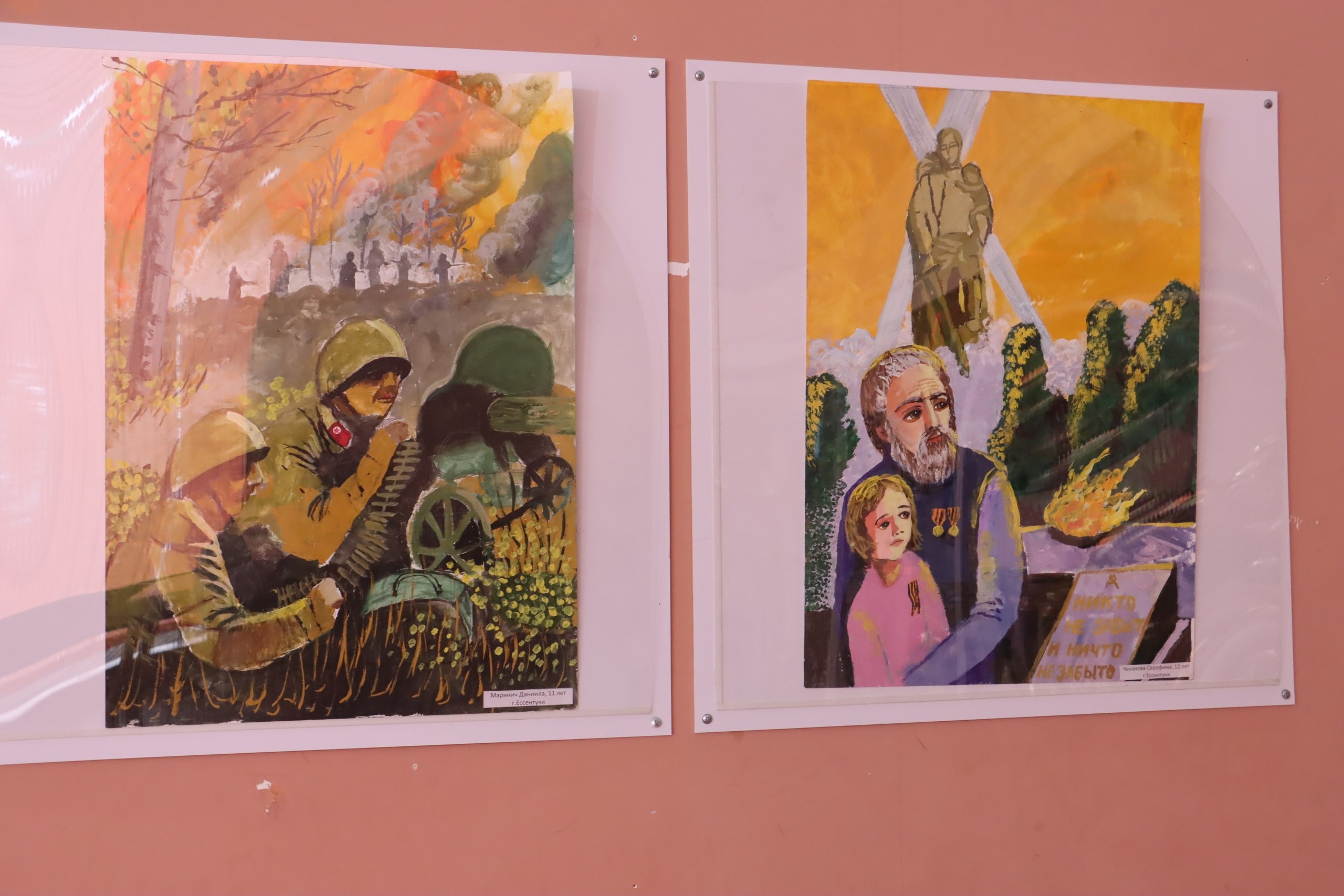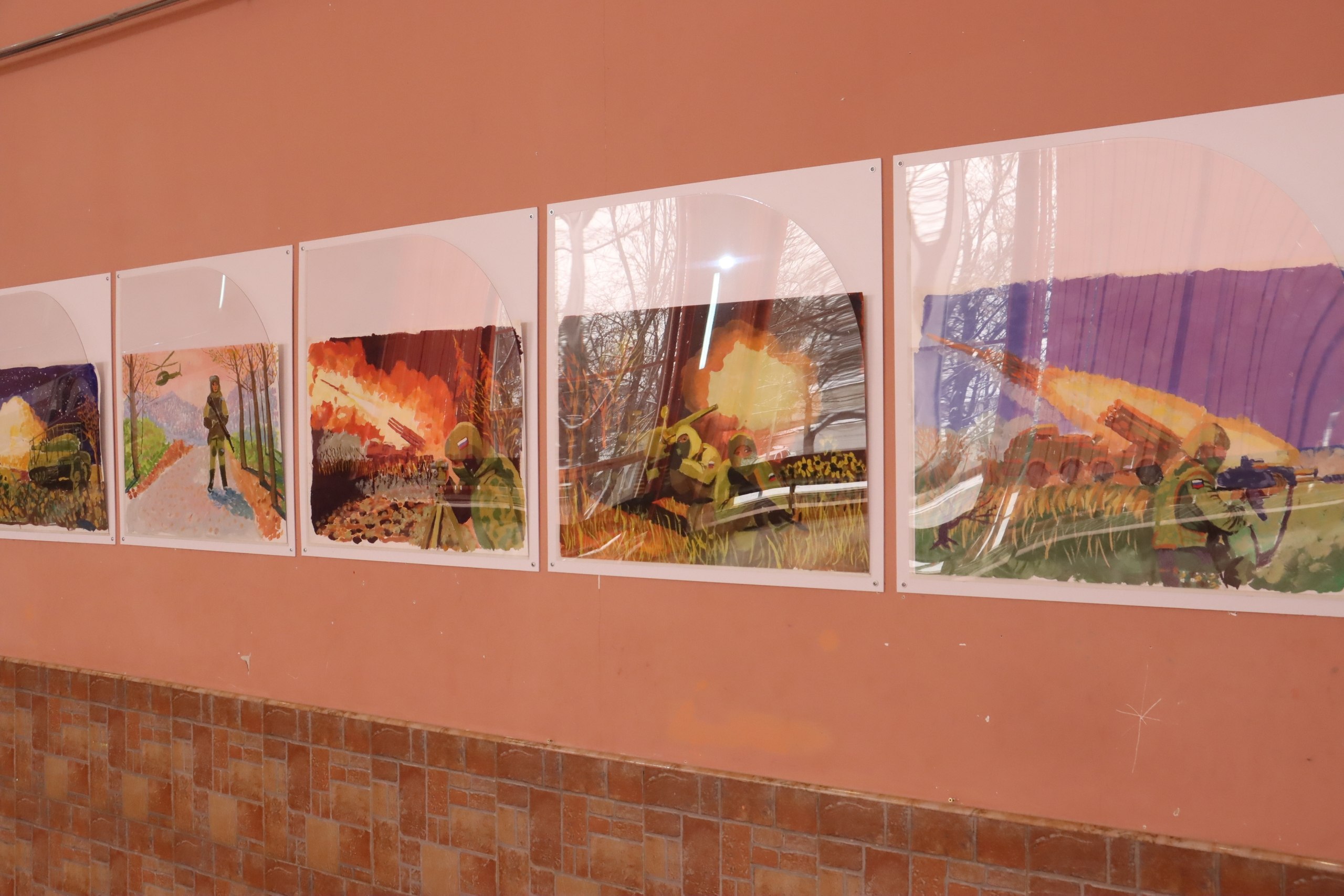Работы учеников изостудии «Колорит» демонстрируют образы защитников Родины, военной техники и ценности мира.