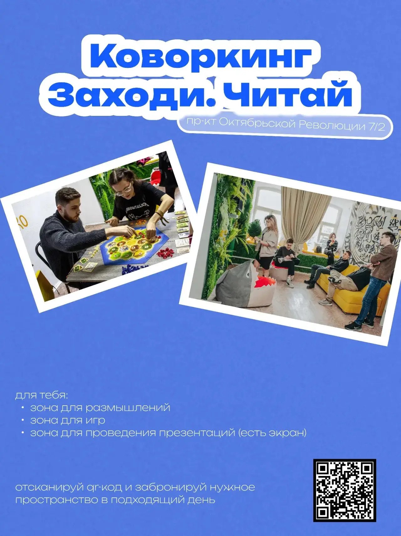 Коворкинг «Заходи. Читай» (центральная библиотека) – уютные столы, диваны и ТВ для презентаций. Забронировать: vk.com/wall-173592400_3755