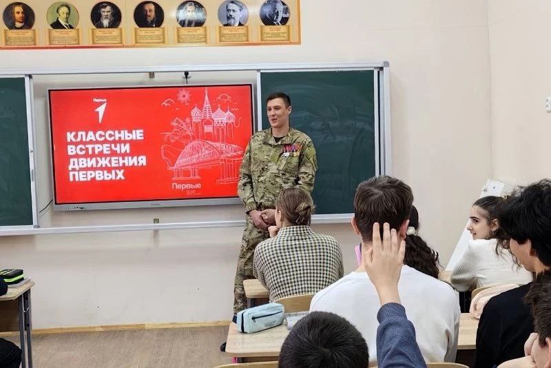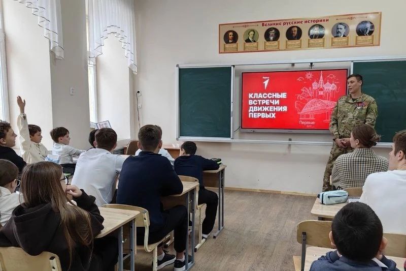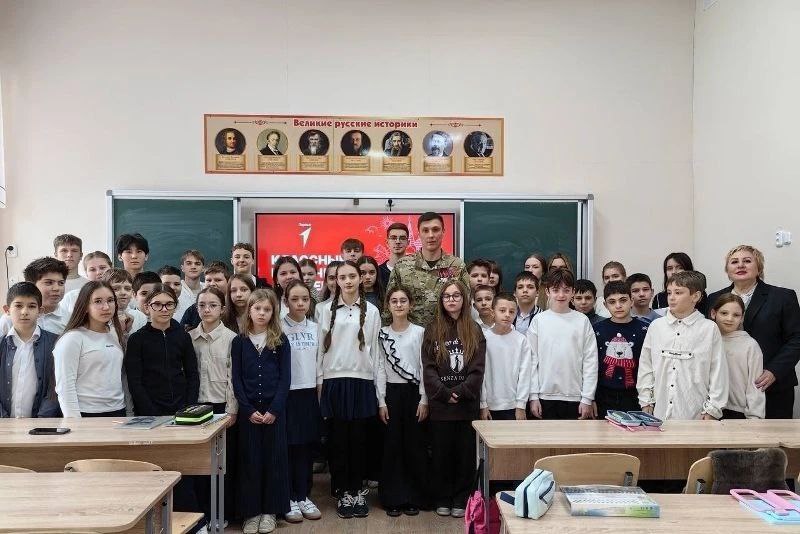В школе №1 ребята поговорили с ветераном боевых действий, участником специальной военной операции, педагогом дополнительного образования лицея №20, победителем краевого этапа Всероссийского конкурса «Воспитать человека», начальником городского штаба Юнармии Дмитрием Кулаковым.