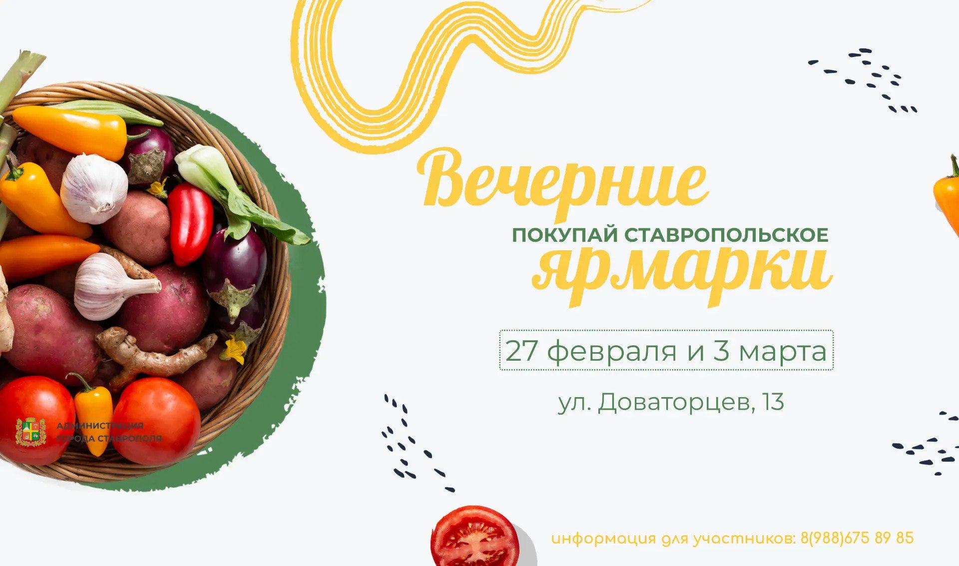 Напоминаем, что по вторникам и пятницам вечерние ярмарки работают на ул. Доваторцев, 13. А 5 марта торговые ряды развернутся также на ул. Доваторцев, 50/1 и ул. Пригородной, 215/1.