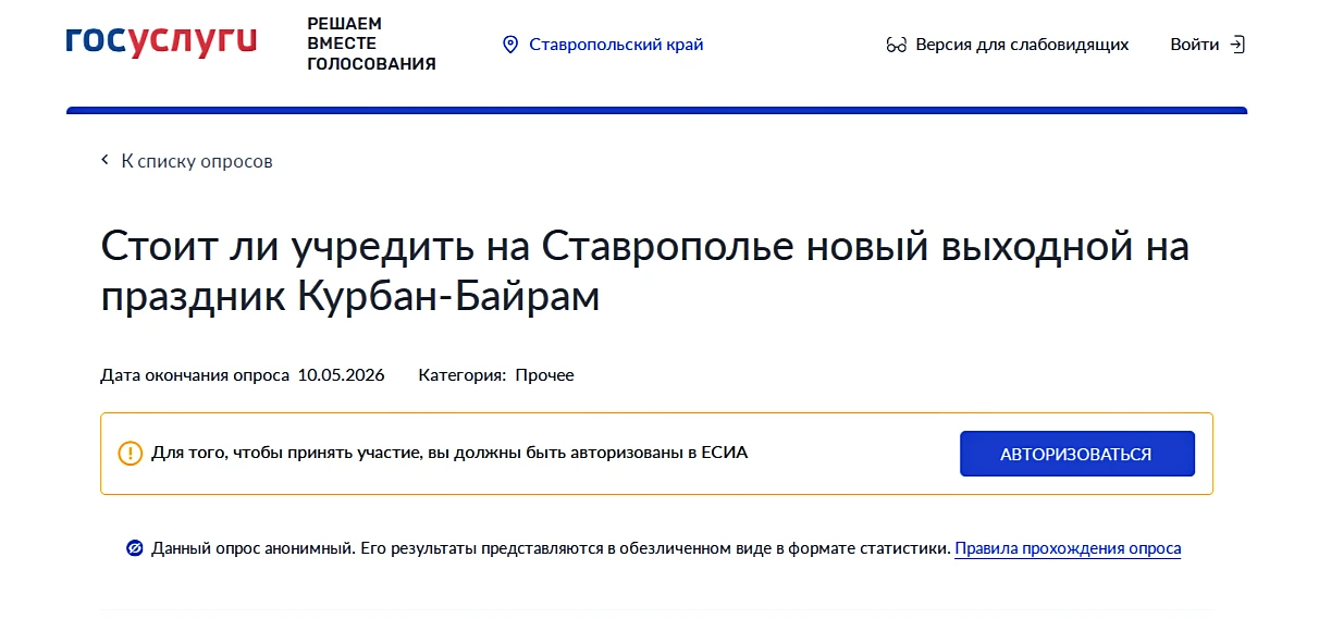 «Ставрополье – многонациональный и многоконфессиональный край. У нас живут люди разных вероисповеданий, и мы с уважением относимся к традициям друг друга. Совсем недавно православные встретили Радоницу, которая по краевому законодательству уже много лет является выходным. Сделать выходной на Курбан-байрам будет справедливо. Но решение станем принимать только с учетом мнения жителей нашего края. Уважаемые земляки, прошу вас его выразить», – отметил Владимир Владимиров.