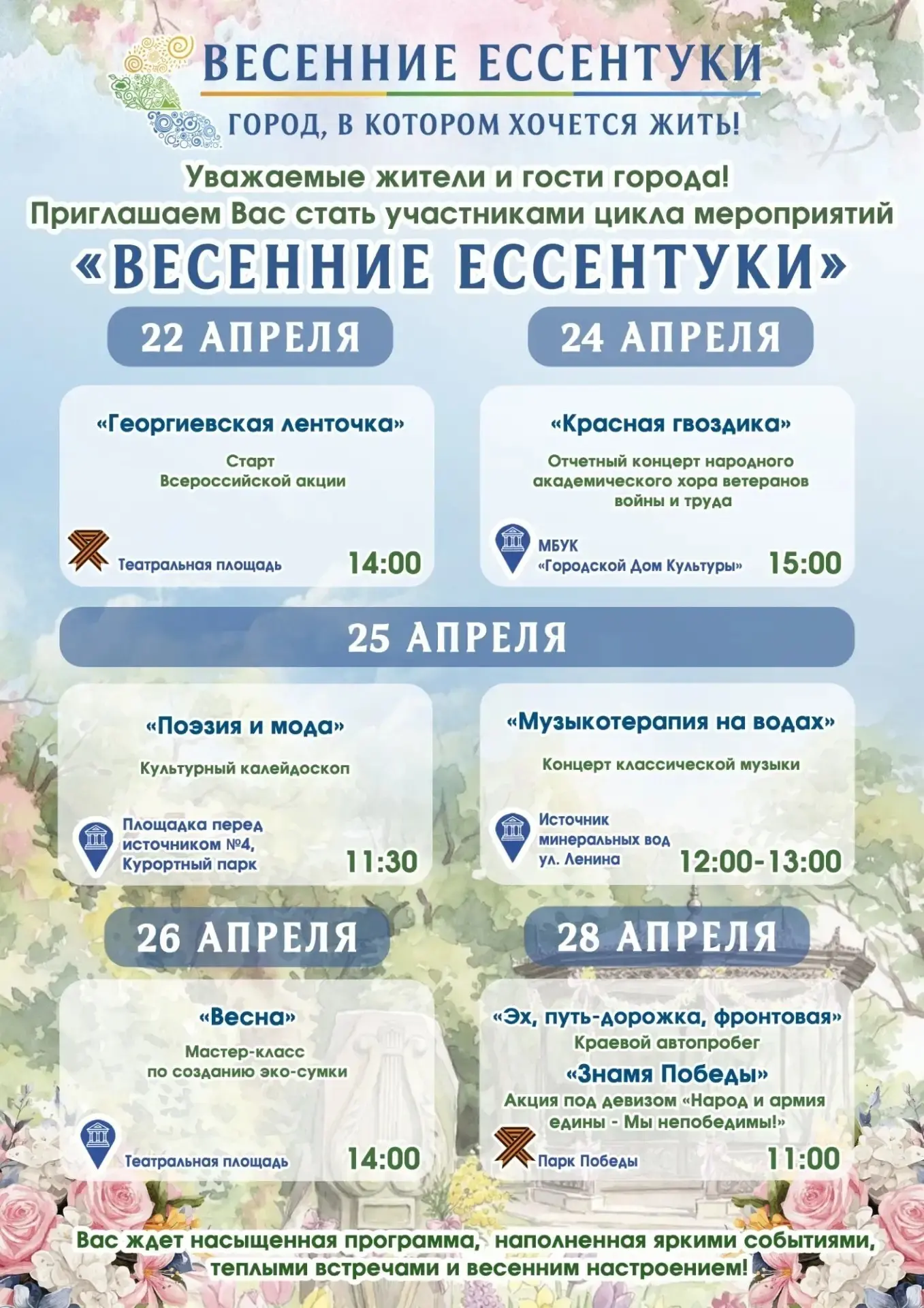 25 апреля, 12:00–13:00 (источник минвод, ул. Ленина) - концерт классической музыки «Музыкотерапия на водах».