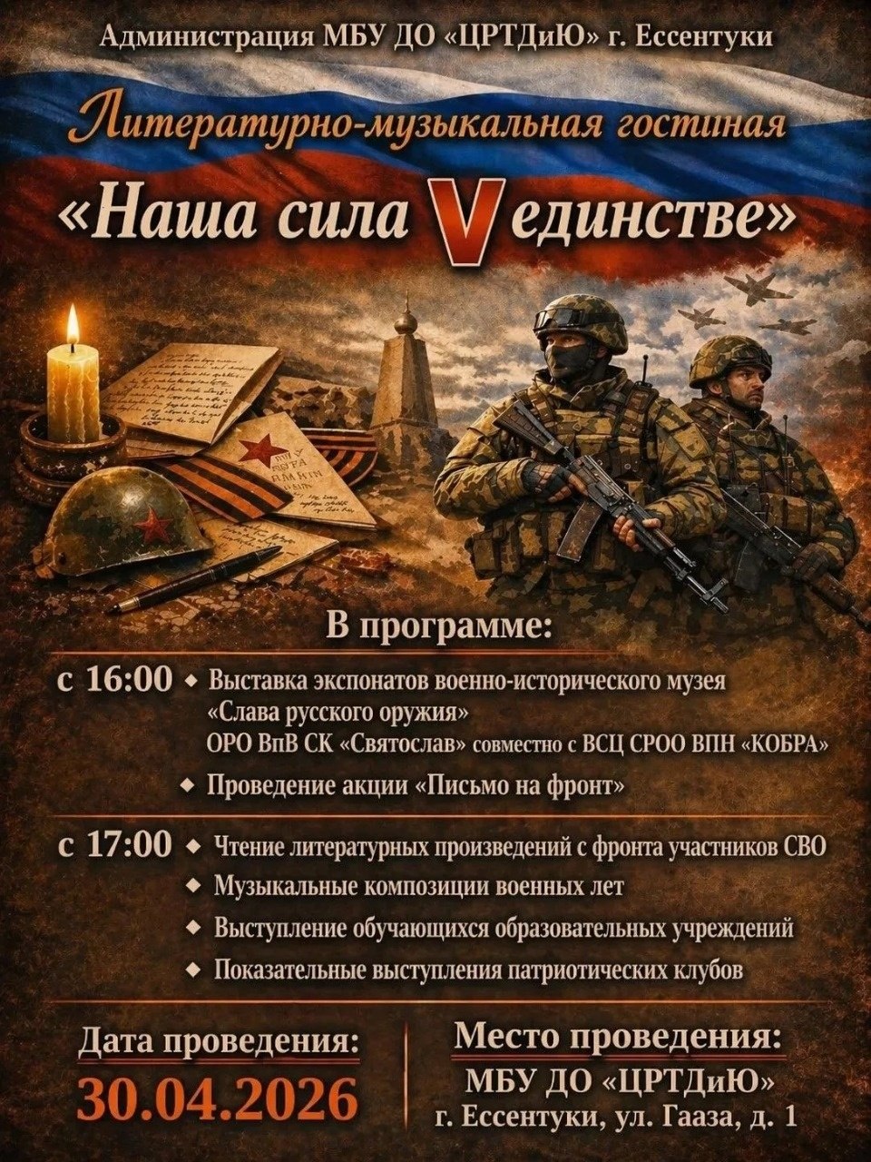 17:00 - чтение произведений участников СВО, музыкальные композиции военных лет, выступления школьников и патриотических клубов.