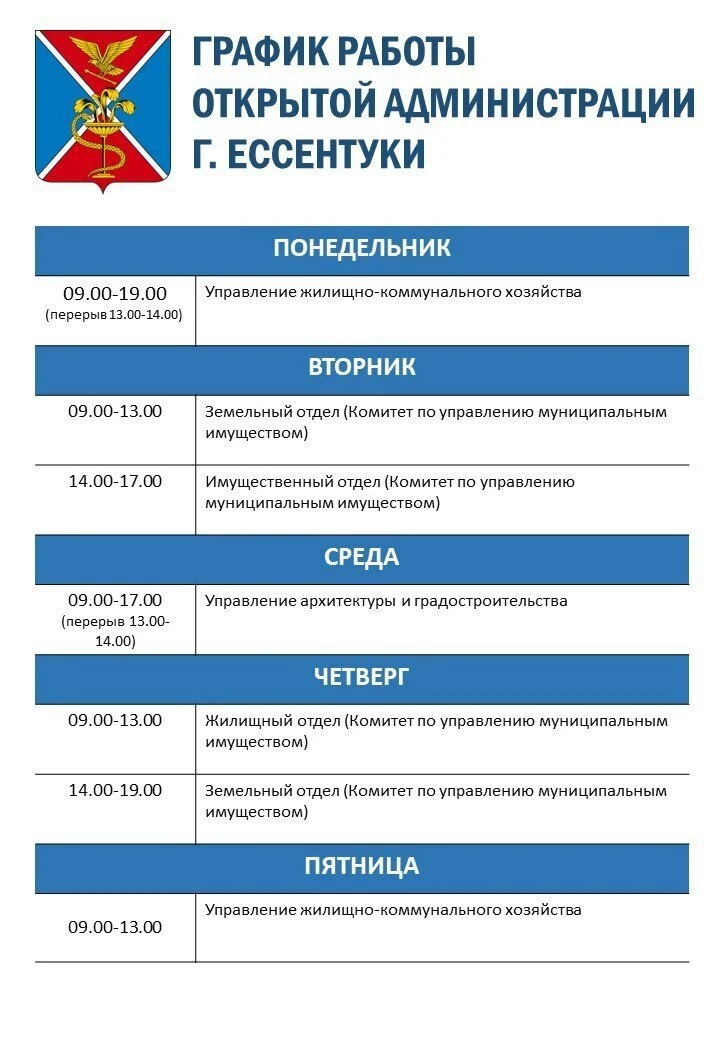 Режим работы открытой Администрации города Ессентуки.