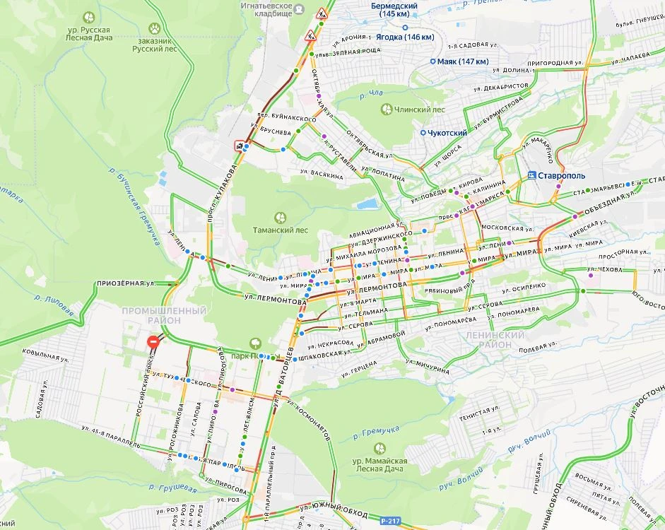 На проспекте Кулакова, недалеко от поворота на ул. Ленина, случилось две аварии. Пробка здесь отмечена бордовой линией.
