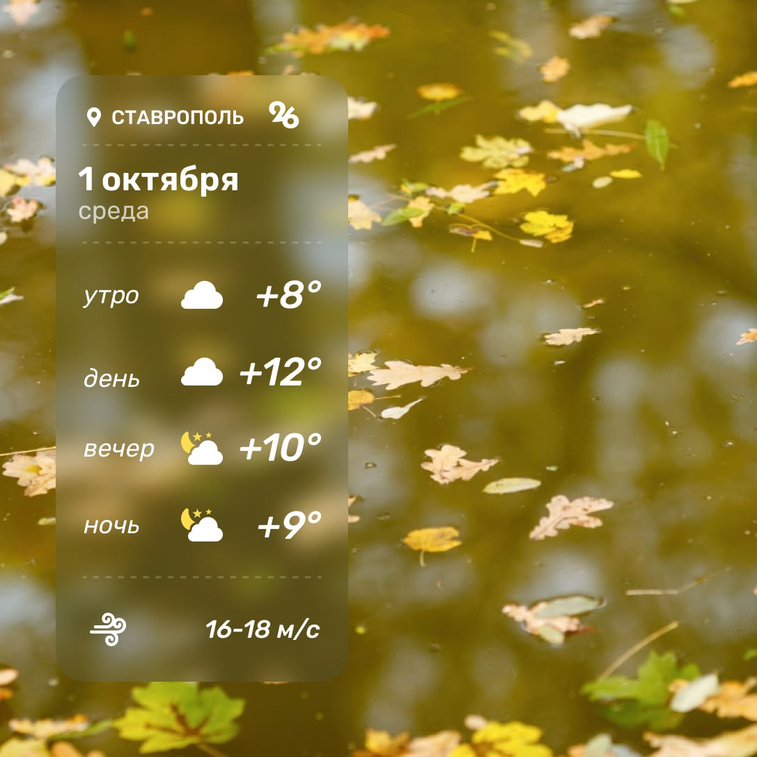 Ветер восточный 6-11 м/с, порывы 15-18 м/с. В среду, 1 октября, температура воздуха по краю ночью +4...+9°, днём +12...+17°.В Ставрополе без существенных осадков...