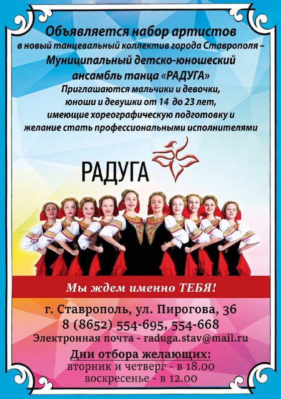 Танцевальный коллектив приглашает талантливых мальчиков и девочек, юношей и девушек от 14 до 23 лет, имеющих хореографическую подготовку и стремление стать профессиональными исполнителями, пополнить ряды артистов. Отбор новых участников проводится в Детской хореографической школе по адресу ул. Пирогова, 36, по вторникам и четвергам в 18.00, а также по воскресеньям в 12.00. Задать интересующие вопросы можно по тел. 554-695, 554-668, raduga.stav@mail.ru.