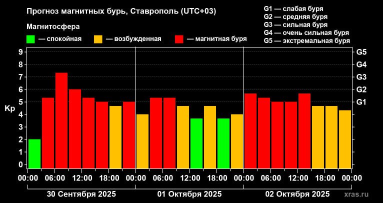 При этом пока что намека на стабилизацию обстановки нет. Буря держится в диапазоне G1-G3, но во вторник, например, поднялась почти до G4.