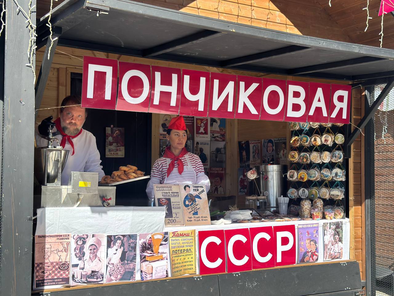 А в Комсомольском парке воссоздали атмосферу советской эпохи — здесь расположились торговые точки, где предлагают ассортимент, напоминающий о прошлом.