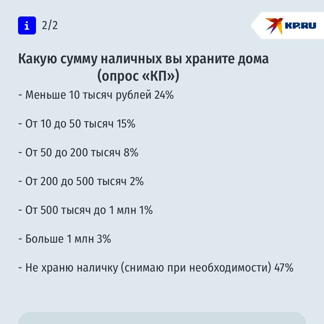 Эксперты напоминают: много денег в наличке держать не стоит. Основные сбережения лучше хранить в банках. Это и выгоднее, и безопаснее. Но некоторую сумму хранить в купюрах все же есть смысл – ситуации бывают разные. Желательно иметь дома запас наличных денег на срок от двух недель до месяца.
