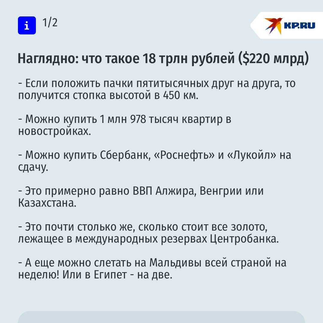 По последним данным ЦБ, россияне держат в своих карманах и копилках аж 18 трлн наличных рублей. Даже если взять эту сумму только в пятитысячных банкнотах, их общий вес составит 3600 тонн. А в среднем на каждого жителя страны приходится по 125 тысяч рублей. На семью из четырех человек – полмиллиона.