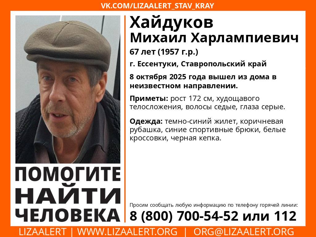 Волонтёры ищут пропавшего 67-летнего жителя Ессентуков Михаила Харлампиевича Хайдукова. 8 октября этого года он вышел из дома в неизвестном направлении и не вернулся, сообщили в ПСО «ЛизаАлерт».