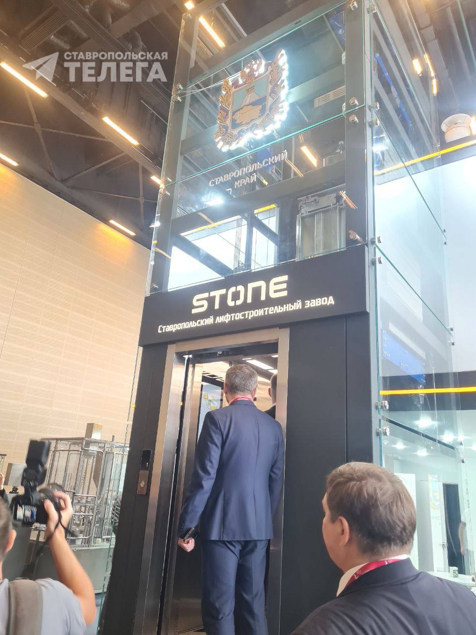 На стенде Ставрополья губернатору представили лифты, дроны и другую технику, которая производится на территории региона.