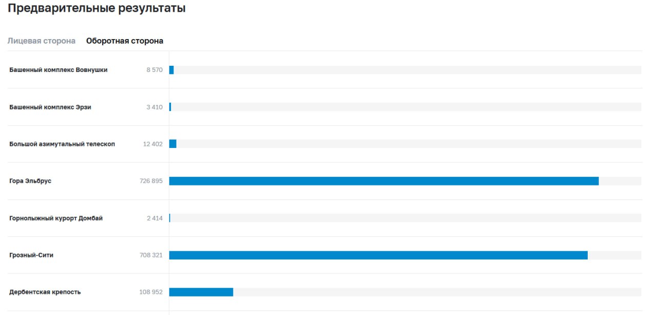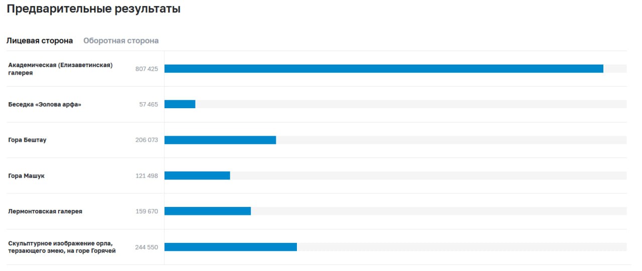 На лицевой стороне по-прежнему лидирует изображение Академической (Елизаветинской) галереи в Пятигорске (более 800 тысяч голосов).
