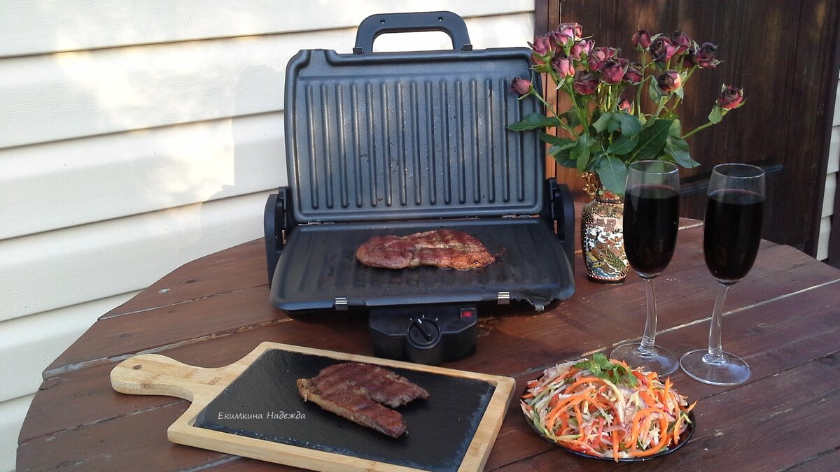 Важно следить за процессом приготовления, чтобы избежать пересушивания мяса. Открытие крышки для проверки позволяет контролировать степень готовности, и это особенно эффективно на таком гриле, который жарит сразу с обеих сторон. После завершения готовки стейки получаются сочными и ароматными, и их стоит подавать с легким овощным салатом для полной гармонии вкуса.