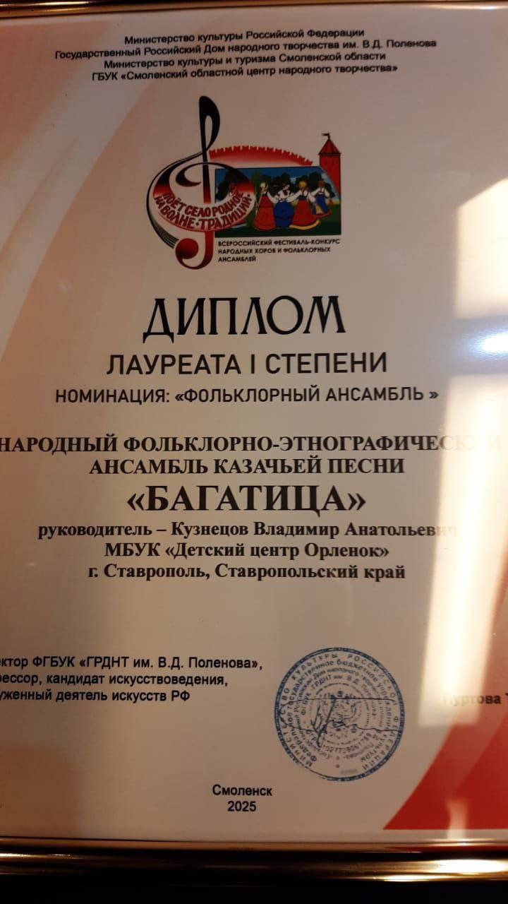 Ставропольский детский ансамбль казачьей песни «Багатица» стал победителем 21 Всероссийского фестиваль-конкурса хоров и фольклорных ансамблей, который состоялся в Смоленске. Юные вокалисты проявили свои таланты, показали высокий уровень мастерства и по праву завоевали звание лауреатов первой степени.