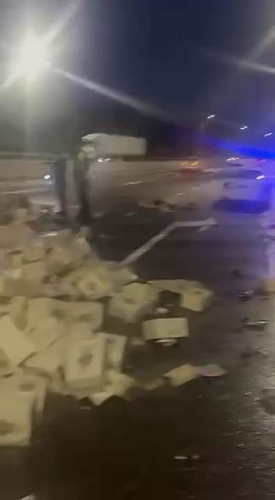 ДТП случилось сегодня на объездной дороге Пятигорск – ТЦ «Гипермаркет Лента». На дороге теперь повсюду ящики с грузинским вином.