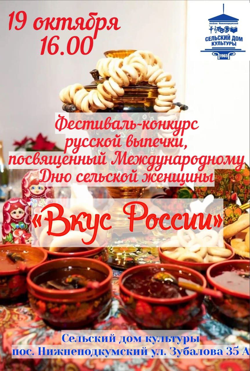 Фестиваль «Вкус России» пройдет 19 октября в Доме культуры поселка Нижнеподкумского (ул. Зубалова, 35а),