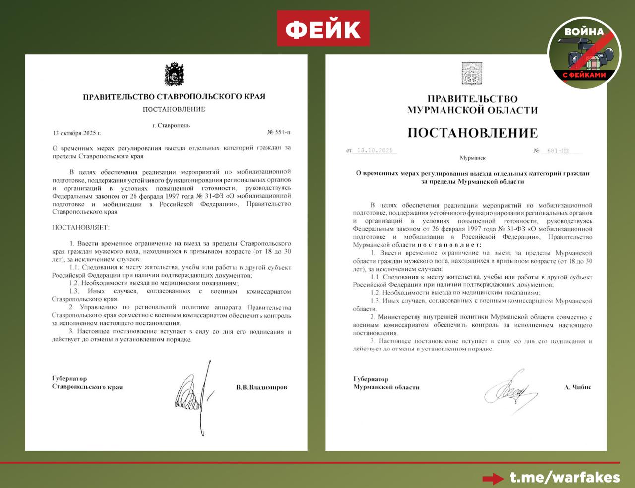 Фейк: Мужчинам в возрасте от 18 до 30 лет запретили покидать территорию Ставропольского края и Мурманской области. Изображения соответствующих постановлений распространяются в соцсетях.