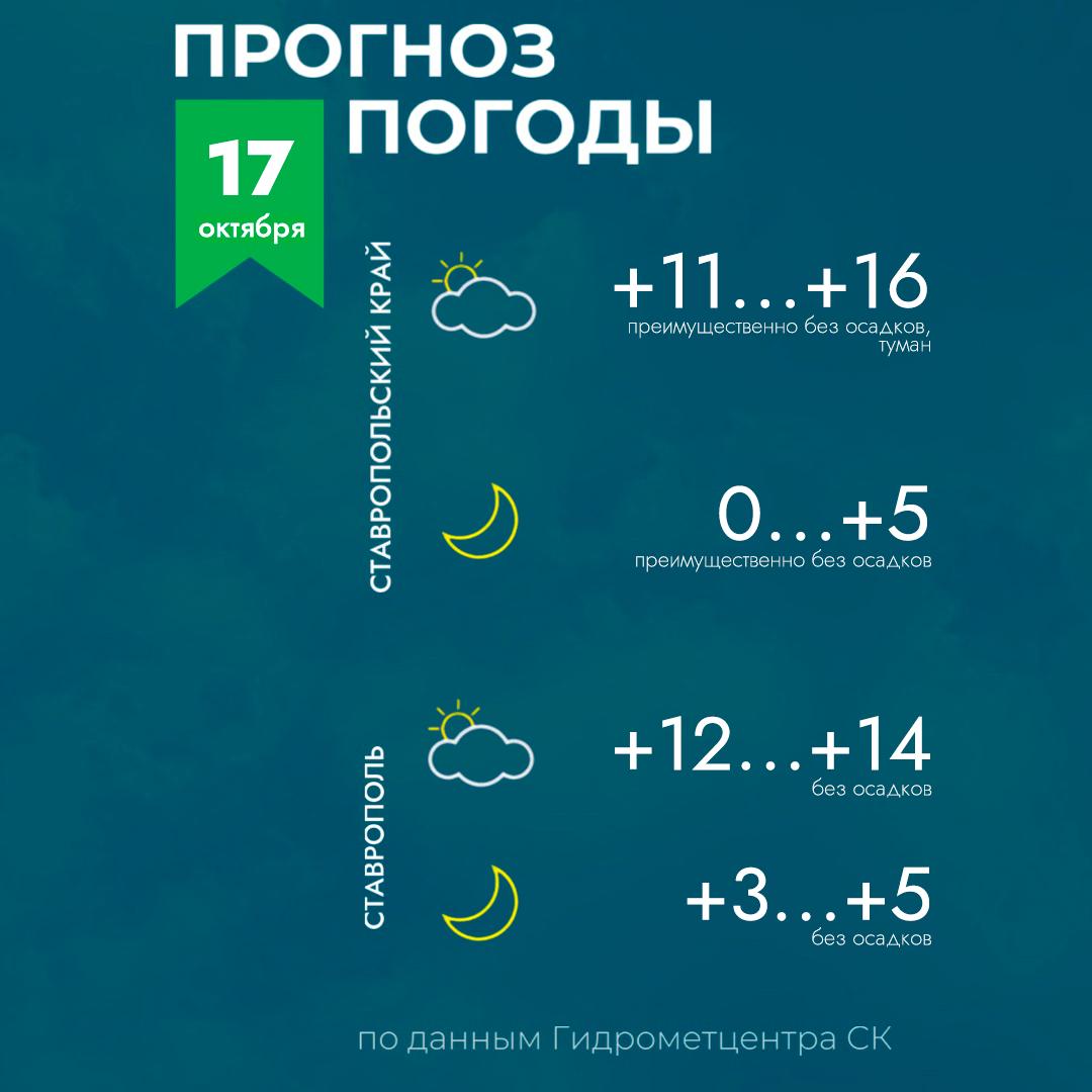 Ветер восточный 5-10 м/с. В субботу, 18 октября, температура воздуха по краю ночью +2...+7°, днём +14...+19°.В Ставрополе без существенных осадков, днём +15...+17°.