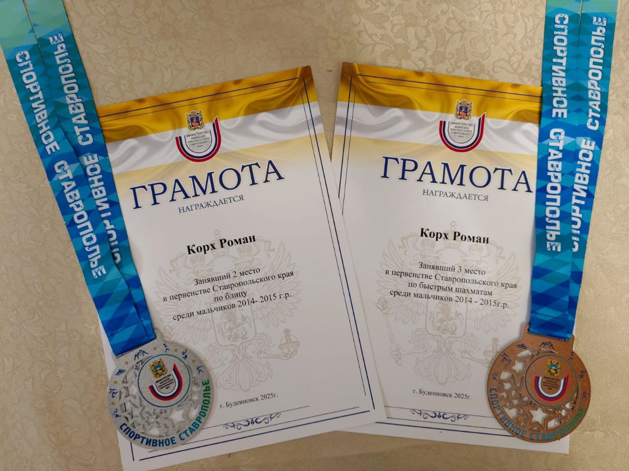 Роман Корх (5А класс) занял 2 место в Первенстве Ставропольского края по блицу (шахматы) и 3 место в Первенстве Ставропольскогокрая по быстрым шахматам.